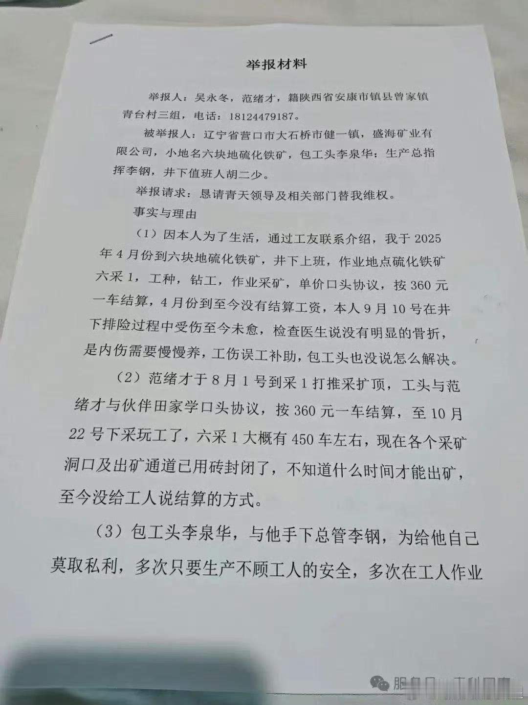 矿坑之下的阴影:盛海矿业违规乱象与监管失语的深层追问在矿产资源开发的法治红线与安全底线日益清晰的今天,辽宁大石桥盛海矿业被曝的多项违法违规行为,如同一记重锤,击碎了公众对“安全生产”“生态保护”的基本信任。基建期擅自采矿、数十米高采空区暗藏坍塌风险、矿工无培训无防护下井作业,废渣乱堆侵占林地、尾矿库紧邻饮用水源保护区……一系列触目惊心的乱象背后,是企业对生命敬畏的缺失,更是监管机制的失灵。而多名矿工实名举报多日后,当地监管部门的沉默以对,更让这场关乎生命安全、生态保护与法治尊严的争议,成为拷问基层治理效能的典型样本。违法乱象:在安全与环保的双重禁区疯狂试探矿产资源开发从来不是“粗放式掘金”的自由地带,而是被法律、规章层层约束的责任场域。但盛海矿业的违法违规行为,几乎覆盖了从生产到环保的全链条,每一项都直指最危险的禁区。安全生产的底线在盛海矿业被肆意践踏。根据矿工爆料,该矿持有的仅为基建手续,按照规定,基建期只能建设采矿、运输、通风、排水和安全监测五大系统,严禁开展大规模开采活动。但企业却公然违背这一核心要求,违规开设6个中段进行大量回采,其中1、2、4中段已采完封闭,3中段接近采空,4、6中段仍在持续作业,形成的采空区高达数十米。采空区如同地下“陷阱”,一旦发生坍塌,井下作业的矿工将面临灭顶之灾,而如此大规模的违规开采,竟能在监管眼皮底下持续进行,令人咋舌。更令人揪心的是矿工的作业环境:无劳动合同、无岗前培训、无健康体检、无班前安全会议,仅购买一份保险便被要求下井,甚至连作业必需的头灯都需自行购买。在密闭墙预留的通人小门内,矿工在隐蔽工作面打炮眼、进行高风险操作,缺乏基本安全防护的他们,如同在“刀尖上讨生活”,每一次下井都可能是与死神的博弈。生态环境保护的红线同样被企业视若无睹。实地调查显示,盛海矿业的废渣废石被随意倾倒在林区,既无防护措施,也未及时覆土复绿,裸露的矿渣在风吹日晒下,极易造成水土流失和扬尘污染。更严重的隐患藏在选矿厂周边:几十米高的尾矿砂下方,多个未做防水处理的水坑紧邻营口市石门水库饮用水水源保护区,距离河道仅数米之遥。根据《尾矿污染环境防治管理办法》,尾矿库选址必须符合生态环境保护强制性标准,严禁在饮用水源保护区等敏感区域周边建设,且必须配套建设防渗、渗滤液收集等污染防治设施[__LINK_ICON]。但盛海矿业的尾矿库不仅选址违规,更缺乏基本的防渗处理,一旦遭遇暴雨或尾矿砂垮塌,含重金属的废水将直接排入河道,污染饮用水源,威胁周边群众的饮水安全。更具讽刺意味的是,营口市人民政府网2025年6月公示的数据显示,该区域尾矿库现状库容为0,这与实地观察到的“几十米高的尾矿砂”形成鲜明矛盾,数据造假的背后,是否隐藏着更深层的监管漏洞?违规开采的规模更是远超审批范围。公开信息显示,盛海矿业采矿许可证批复的年生产能力仅为5万吨,采矿面积0.0545平方公里,开采深度为490米至275米,开采高度仅215米。但按照矿工所述的“每个中段采空区几十米”计算,该矿实际开采高度已达400米左右,远超审批标准,非法开采的矿石通过装载机装车后,被运往几公里外的选矿厂深加工,形成了“非法开采—运输—加工”的完整黑链条。企业如此明目张胆地突破审批限制,本质上是对矿产资源法的公然藐视,更是对国家资源权益的肆意侵占。监管失语:高压政策下的“沉默之谜”盛海矿业的违法违规行为并非隐秘进行,多名矿工愿意配合调查人员下井核实采空区情况,实地调查也轻易发现了废渣乱堆、尾矿库违规等问题,证据链清晰、事实明确。但令人费解的是,在矿工实名举报多日后,大石桥市相关监管部门始终未给出任何调查结果,这种“沉默式监管”比企业违规本身更令人担忧。事实上,国家层面近年来持续加大对矿产资源管理和安全生产的监管力度,形成了高压整治的政策环境。2025年7月1日起施行的《中华人民共和国矿产资源法》(2024修订版),进一步强化了对非法采矿的惩处力度;最高人民法院明确要求对盗采矿产资源犯罪坚持“全要素、全环节、全链条”打击标准;2025年9月,国务院安委办再次部署严厉打击盗采盗挖矿产资源等非法违法行为,切实维护人民群众生命财产安全。从中央到地方的政策信号层层递进,彰显了整治矿产领域乱象的坚定决心。在如此明确的政策导向下,大石桥市相关监管部门的“不作为”显得格外刺眼。盛海矿业的违规行为涉及多个监管领域:非法开采违反矿产资源管理规定,应由自然资源部门监管;安全生产隐患直指应急管理部门的监管责任;废渣乱堆、尾矿库污染涉及生态环境部门的监管职责;矿工未签合同、无培训上岗则关联人力资源和社会保障部门的监管义务。多个部门的监管“真空”,使得企业得以在多领域违法而不受约束,这背后究竟是“懒政怠政”的不作为,还是存在更深层的利益捆绑?类似的监管失语并非个例。陕西镇安矿业案中,企业八年盗采获利1.5亿元,举报人提供明确测绘证据后,监管部门仍出具“无越界开采事实”的虚假结论,甚至以“复工需签封口承诺”威胁举报人;湖南沅陵鑫瑞矿业长期侵权,当地自然资源局以“超深越界”等技术性问题搪塞,对矿区污染、尾矿库隐患等核心