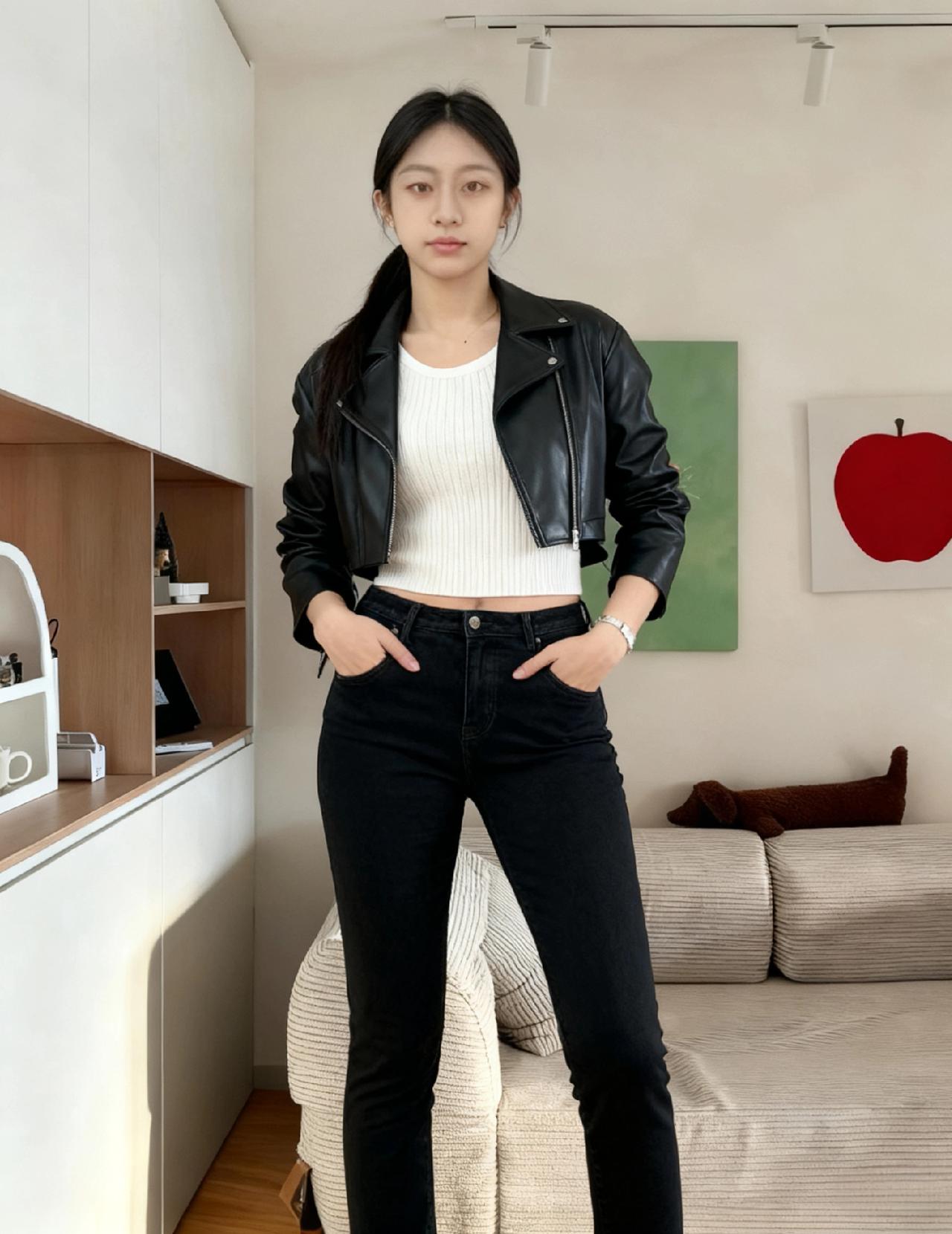 金属拉链是时间的齿 咬住了清晨的雾 皮质的光泽在呼吸 是未说出口的爱慕 ~ 白针织衫是云的碎片 落在锁骨的浅湾 牛仔裤包裹着沉默的海 等潮汐漫过脚踝 ~ 她站在房间的中央 像一幅未完成的作品 只有红苹果在墙上 替她说出了所有的话