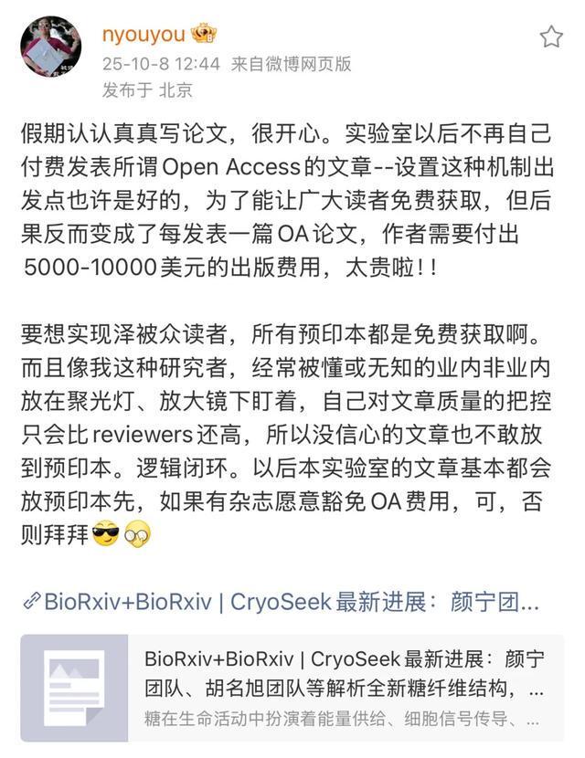 这一成果发布,也是颜宁对此前公开声明的实践。10月8日,颜宁曾发微博称,不再为OA发表支付高额费用,以后实验室的文章基本会先发预印本。预印本是指研究者未经正式同行评议而先行公开的论文版本。她指出,目前每发表一篇OA论文,作者要承担5000—10000美元的出版费用,“太贵啦”。“如果有杂志愿意豁免OA费用,可,否则拜拜。”