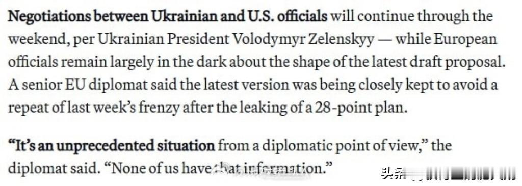 懂王铁心拒绝欧洲上桌吃席。 《政客》杂志:美国向欧洲隐瞒关于乌克兰问题解决方案的最新计划 欧盟一位高级外交官表示,最新版本的计划被精心隐瞒,以避免重蹈上周 28 点计划泄露后引发的骚动覆辙。 一名欧洲议会议员说道:“从外交角度来看,这是史无前例的情况。我们中没有人掌握任何信息。” 在肥鹅看来,由食客变成餐点,这也是欧洲自找的,以前中俄都想让他们上桌,当多极世界里的一极,可欧洲就想做被人吃的菜,能怪谁呢。 俄乌冲突