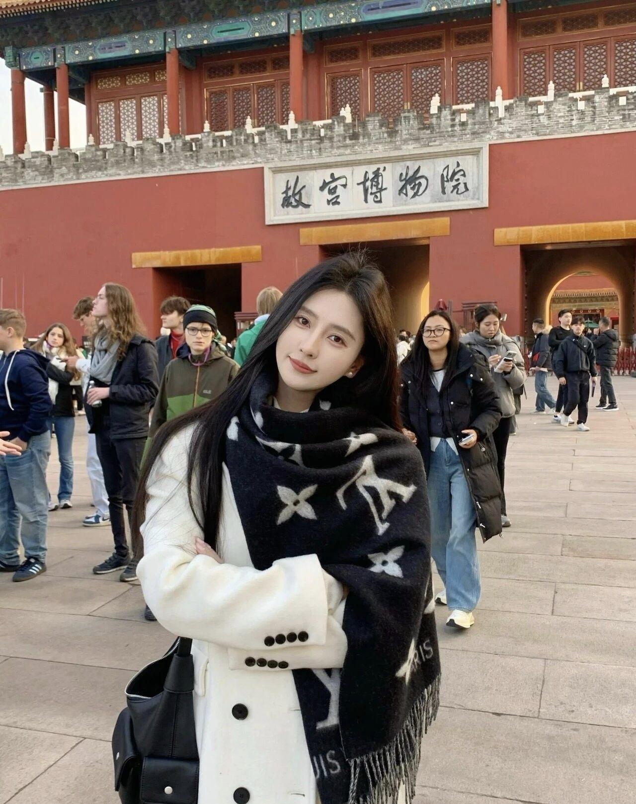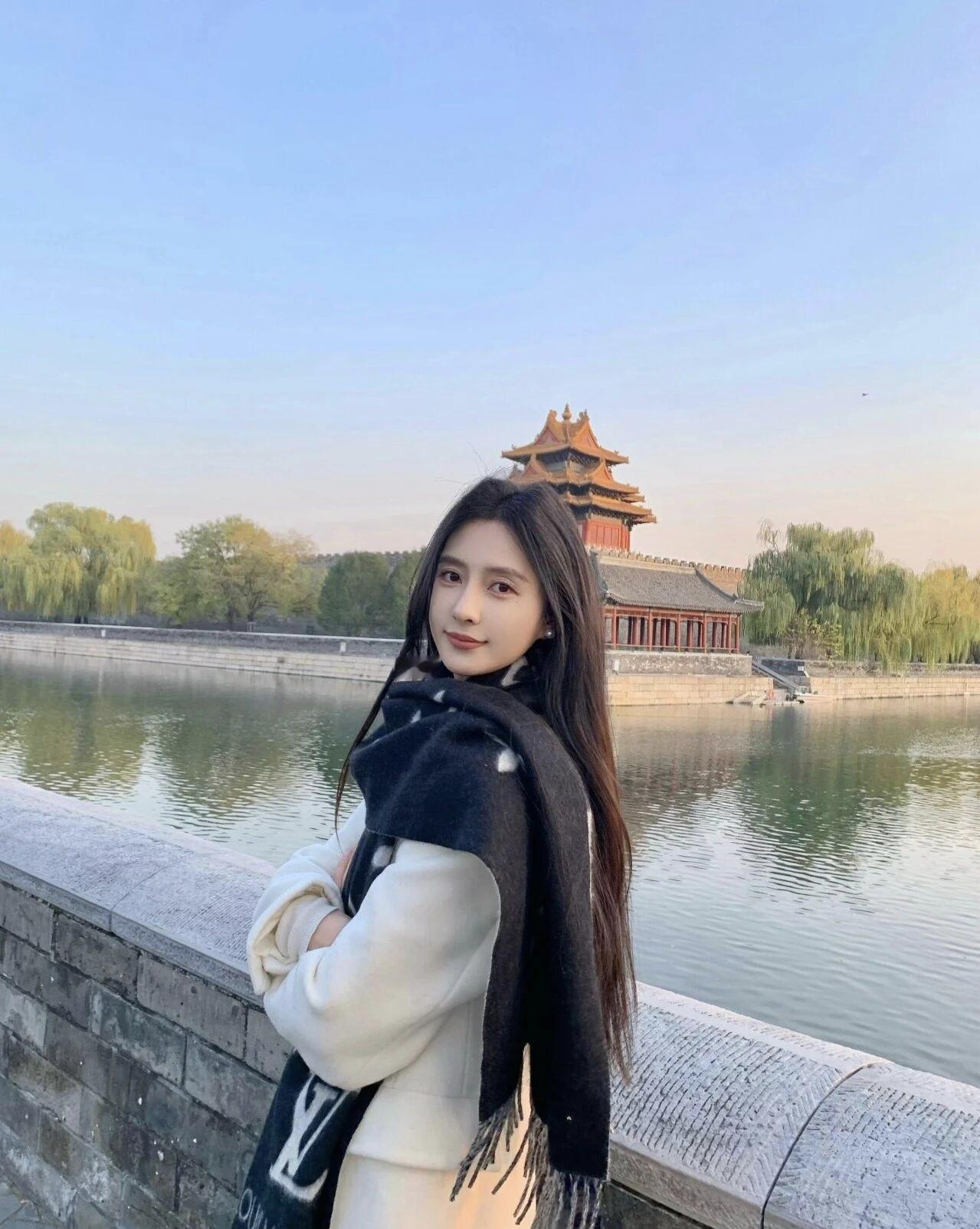 日落给故宫的红墙镀了层暖光,水边的风裹着秋意,围巾上的纹路和殿宇的飞檐撞了个古今