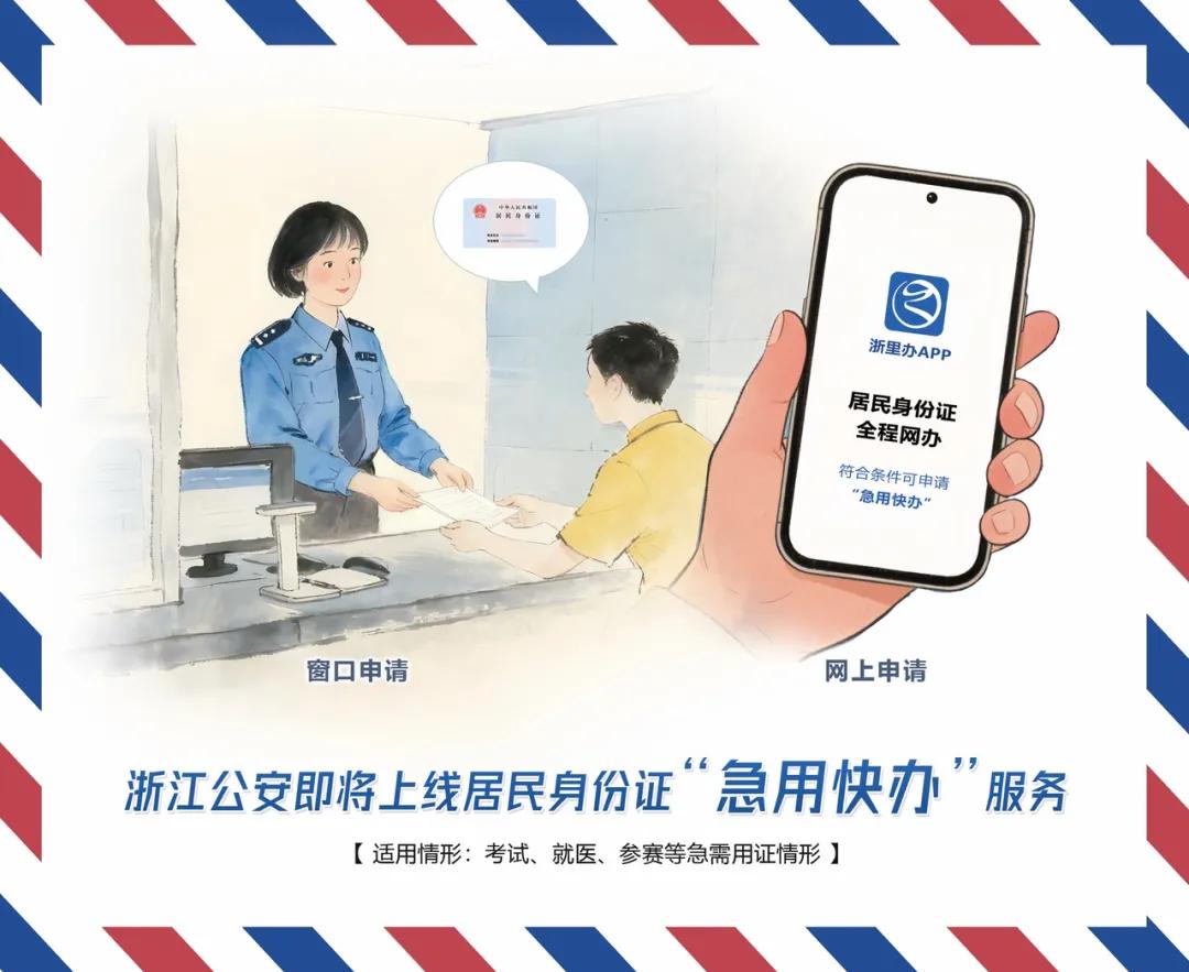 事关身份证!12月1日起,全省正式推出!12月1日,浙江省居民身份证“急用快办”服务将正式在“浙里办”App上线运行。届时,群众在参加考试、参赛、省外就医等急需用证情况下,只需申请该项服务,即可在3至5个工作日内领取证件。 今年6月,浙江省公安厅居民身份证制作中心面向中高考考生首次推出“急用快办”6项举措,包括开辟“急用快办”通道、提升制证发证效率、设立临时办证窗口等。如今,依托“浙里办”App,该服务再度升级,通过“一键申请”,为广大群众在特需场景下提供更精准、更便捷、更高效的政务服务保障。据悉,群众在距急需用证事项发生前5至7个工作日(含),可通过“浙里办”App“浙警在线(浙警服务宝)”服务版块中“急用快办”功能申请该服务。群众最快3个工作日(中心本级领取)、至迟5个工作日(邮政特快专递)即可领证,在现有条件下最大程度压缩等待时间、提升办事便利度。 为确保服务规范有序落地,中心已同步印发工作指引,并面向全省公安机关身份证制发条线开展政策解读和业务培训,确保各地服务标准统一、执行规范。同时,针对“急用快办”服务上线,开展精准宣传,进一步提升群众知晓度。此外,中心还同步开通专用热线(0571-86780000),在工作日9时至17时为群众提供咨询、查询服务,并增设24小时居民身份证自助取证机,确有特殊需求的群众可直接前往中心取证。 省公安厅相关负责人表示,浙江公安将持续聚焦群众急难愁盼问题,不断优化居民身份证各项服务内容与办理流程,以更加规范、便捷、多样的政务服务,不断增强群众获得感、幸福感和安全感。 来源:临海发布