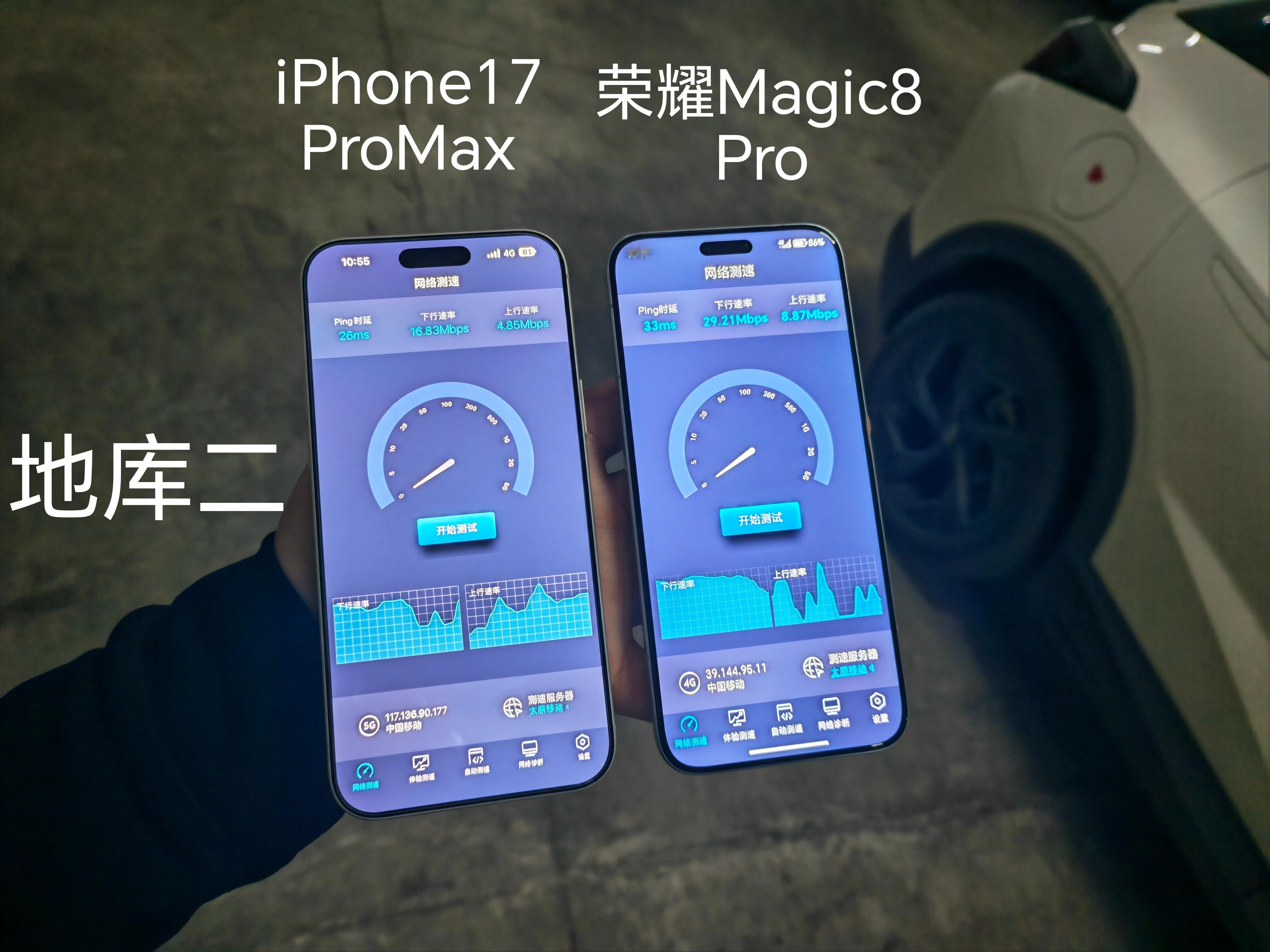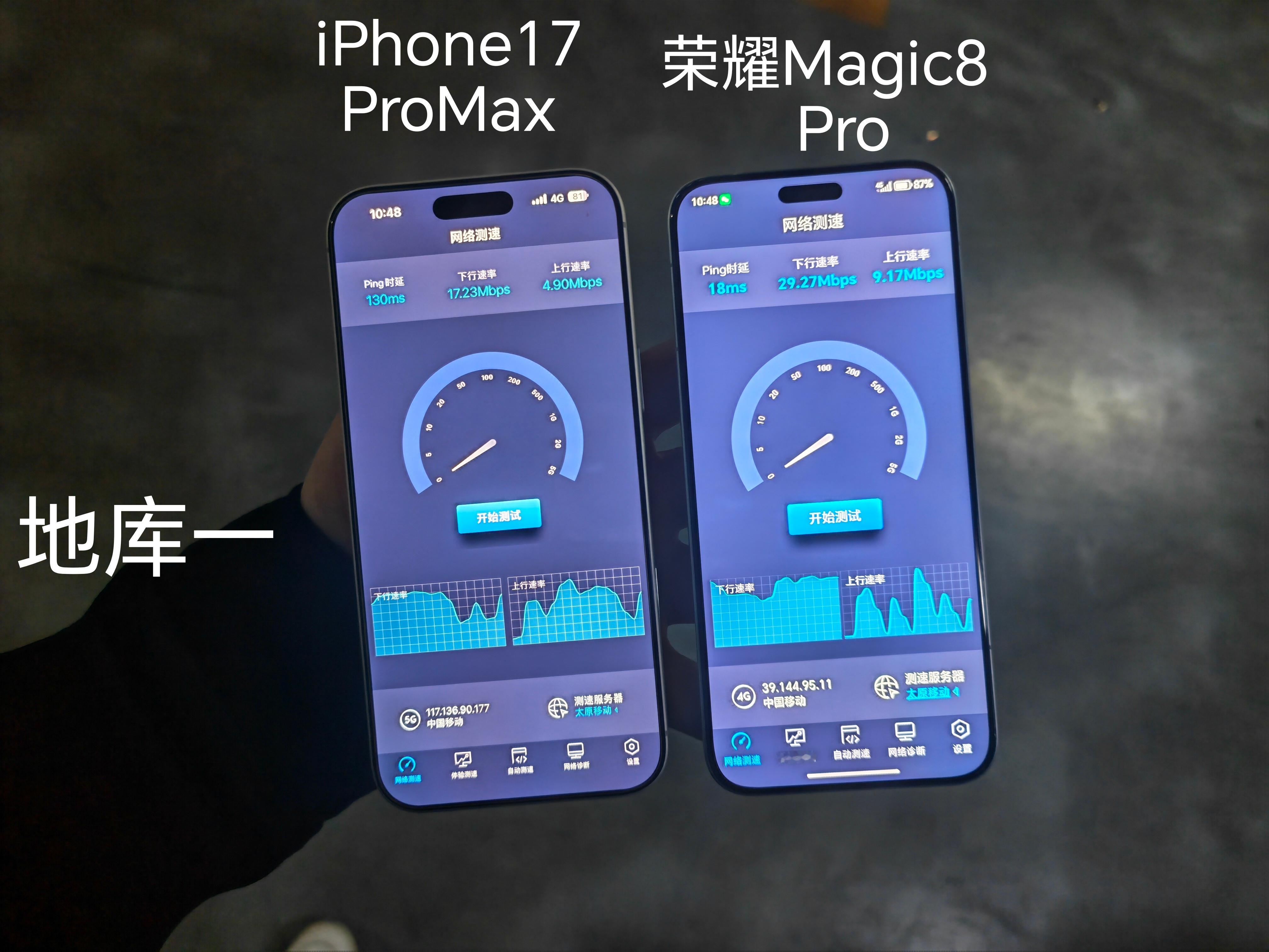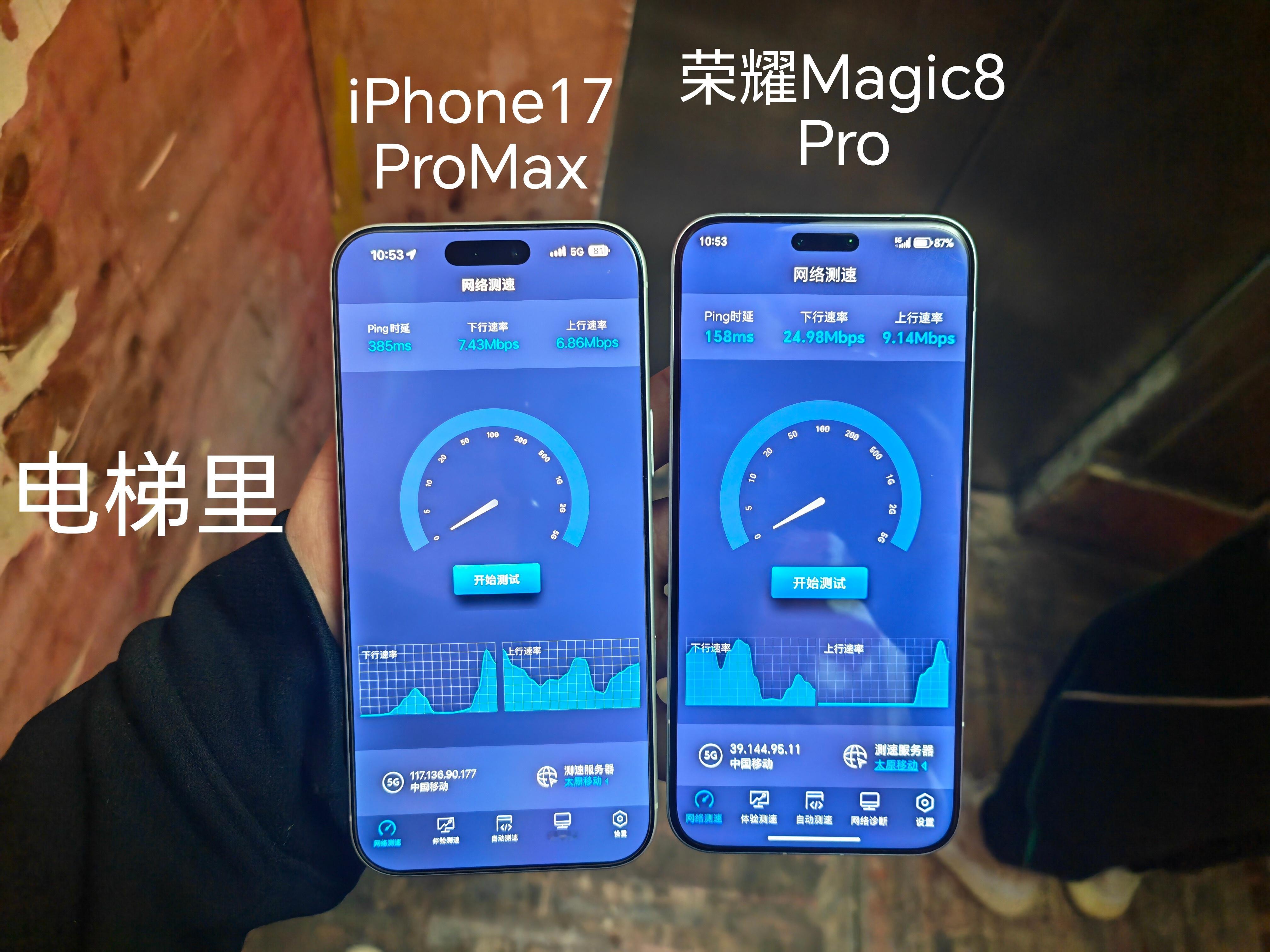 一直好奇今年iPhone17ProMax的信号咋样,今天拿荣耀Magic8 Pro和它做了个对比,在地库和电梯里面都做了测试,两张移动的卡,条件都一样。iPhone17ProMax信号我自己用下来比之前的16有提升,但是相比荣耀Magic8 Pro差距还挺大,具体可以看图。荣耀的这个信号确实有一手,三个不同地点,Magic8 Pro完胜,速率翻倍。