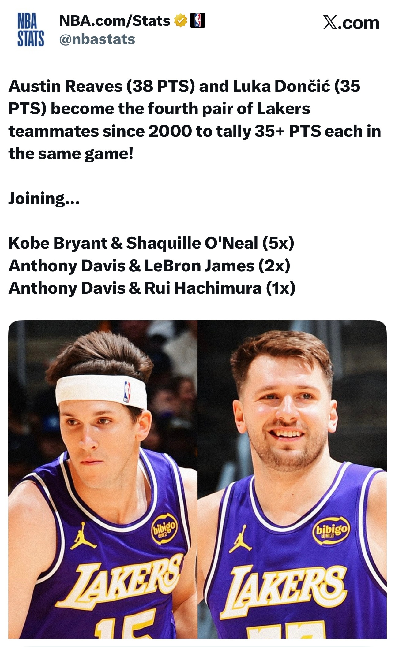 今天里夫斯(38分)东契奇(35分)成为了湖人队自2000年以来第四对同场得到35分以上的组合。前三对组合是:奥尼尔和科比(5场)詹姆斯和戴维斯(2场)戴维斯和八村垒(1场)