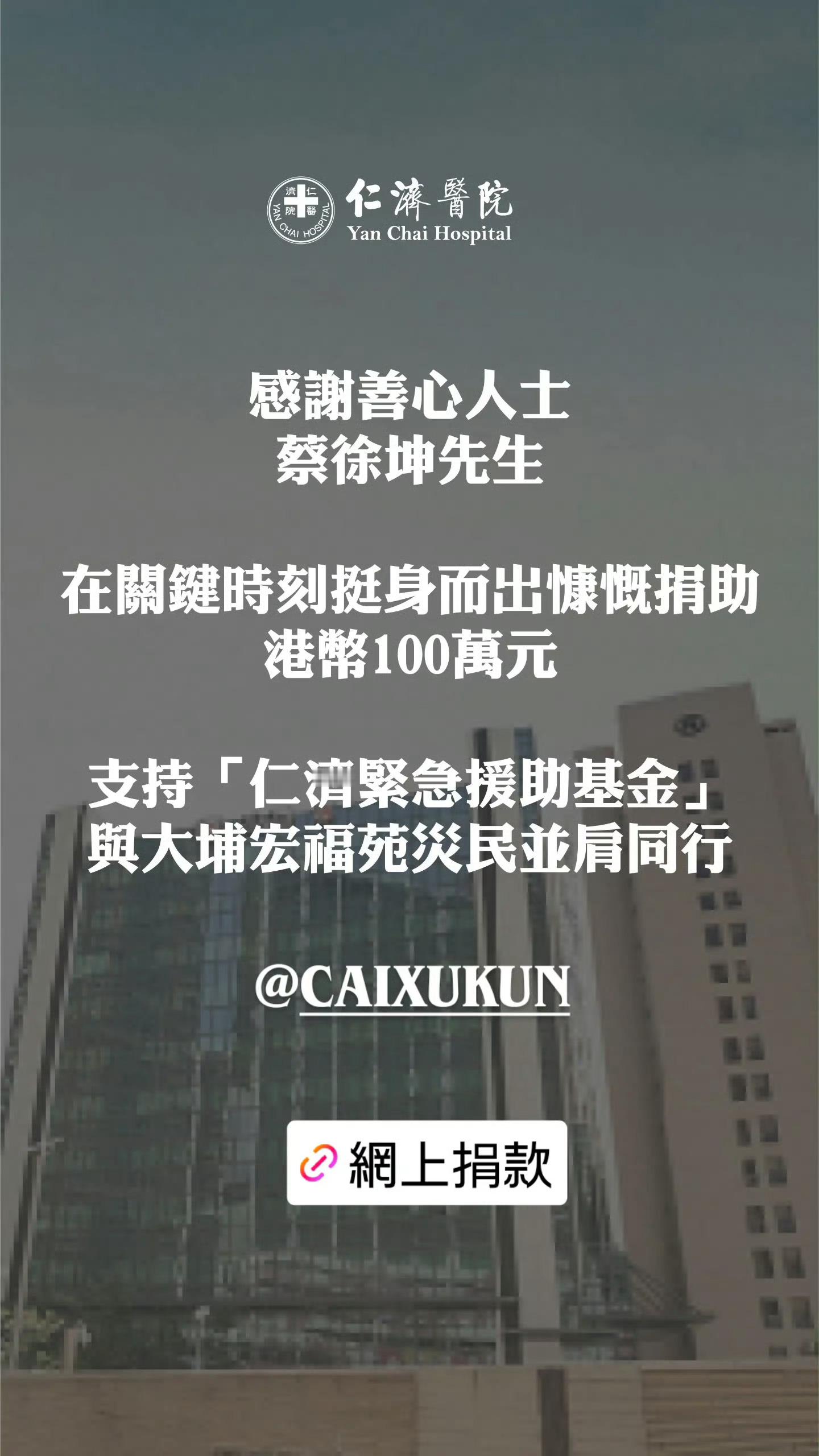 蔡徐坤向香港捐款100万蔡徐坤先生向仁济医院「仁济紧急援助基金」捐助港币100万元。【全部善款用于灾民支援,不扣除任何行政费用】