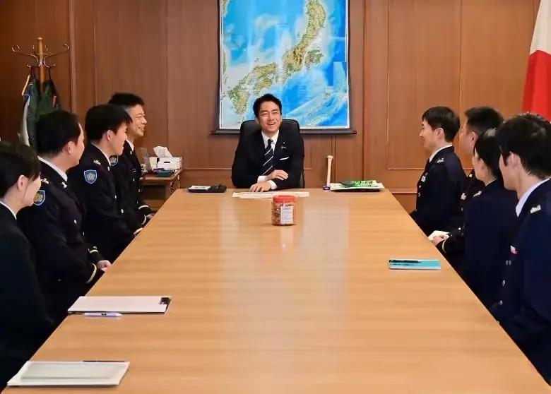 小泉进次郎在日本防卫省主持会议,从现场可以看到,与会人员以年轻人为主,面前也并没有大块头记事本或者笔记本电脑。会议桌上竟然放在一罐坚果,难道开会还这么不问严肃吗?当然,会议的主角是小泉进次郎,只见他笑得春风满面,背后赫然挂着一副日本地图。