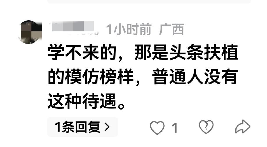 今天写了一篇向素老三学习的一篇微文,说要向她看齐,评论区的网友给我泼冷水,一时不知道该信还是不信? 网友说,那几个网络大V在头条赚得盆满钵满,头条这是在为创作者们树立模仿的榜样,普通人不会有这样的待遇! 仔细想想,网友的评论也有道理,头条树立榜样就是画饼充饥,给人一种奋斗的希望!不断前进的动力,但看得见,却触不着。 素老三,头条扶持的重点对象,素老三的作品、头条给的流量很多很多,所以素老三的文章几乎篇篇都是爆款,普通人真是难以触及。 头条给予大V的流量就像是跑车,而给予我们普通创作者的流量就像是拖拉机,我们普通创作者无论如何努力、沿着他们成功的足迹去追赶,永远也不会赶上,甚至连他们的尾灯也看不到。 但是我是一个倔强的人,瞄准了目标、就不会轻易放弃,我还是决定,努力去追赶。 我认为,素老三等大V们的成功绝不会偶然,他们的成功自然有他们成功的道理,我坚信那些大V的成功一定是在起始阶段付出了巨大的努力,不说别的,就他们的创作实力、写作水平,普通人还真与他们不在一个档次,这就是他们坚持创作,不断成长的成果! 不气馁、不抱怨,抱着美好的希望前景、不断往前冲,用勤奋与时间成就自己的真本领,不相信头条永远给予我的是拖拉机! 我就是不服输!不去拼一拼怎么会知晓最后的结果如何,那怕真的无法触及目标、也无从后悔!