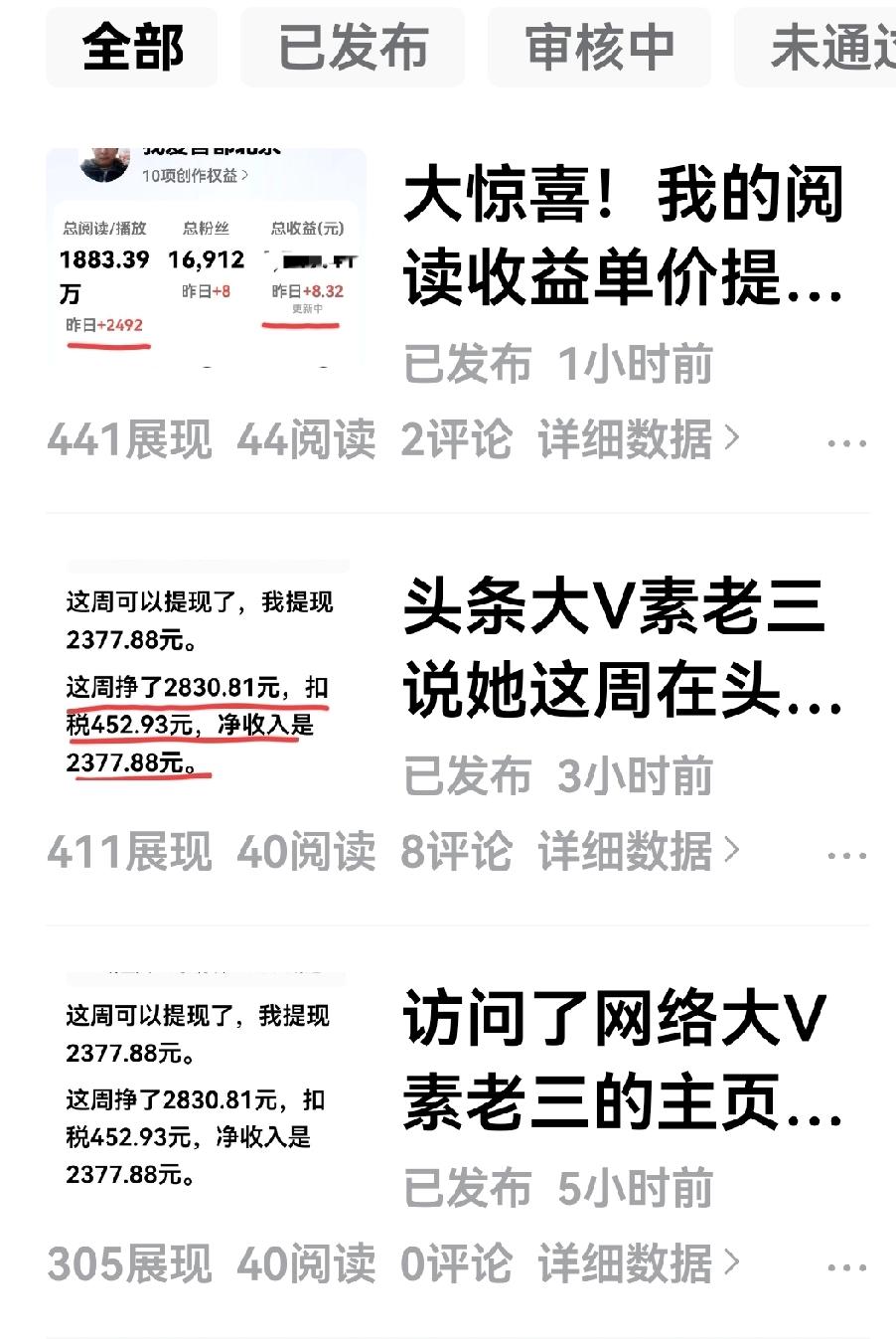 今天写了三篇微头条,头条就是不肯给流量,不过我也不着急,因为我发觉,这几天我的作品基本都是冷酒漫发烧,或许是明天,就会有一篇突然火起来。 头条不肯给当天的作品给流量,但前几天的作品,头条还在推,所以这几天,每天的总阅读量基本能达到两千多以上,头条给的单价倒是很不错,今天就发给了我8元多的薪酬。 我多次承诺,每天将保持日更五、六篇的微头条数量,现在我的任务还没有完成,这篇是第四篇,今天无论头条给不给流量,我决定坚决完成五篇的任务! 头条创作其实是一种兴趣爱好!有空余时间,就写写一天的感受,记录当天的生活,即使没有流量,没有收入,也觉得是一种乐趣!打发了无聊的时间,至于收入的问题不是很重要,早就放下了,多少年以后,只要打开头条,就知道当天具体做了哪些事,这也是收获,是珍贵的财富!