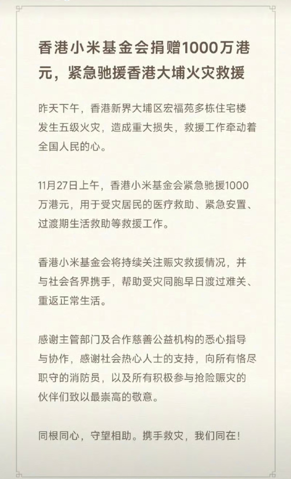 【雷军:香港小米基金会捐赠1000万港元 紧急驰援大埔火灾救援】11月27日,小米创办人,董事长兼CEO雷军发文表示,香港小米基金会捐赠1000万港元,紧急驰援香港大埔火灾救援。祈愿逝者安息、伤者康复,受灾同胞早日渡过难关。官方表示,香港小米基金会将持续关注赈灾救援情况,并与社会各界携手,帮助受灾同胞早日渡过难关重返正常生活。