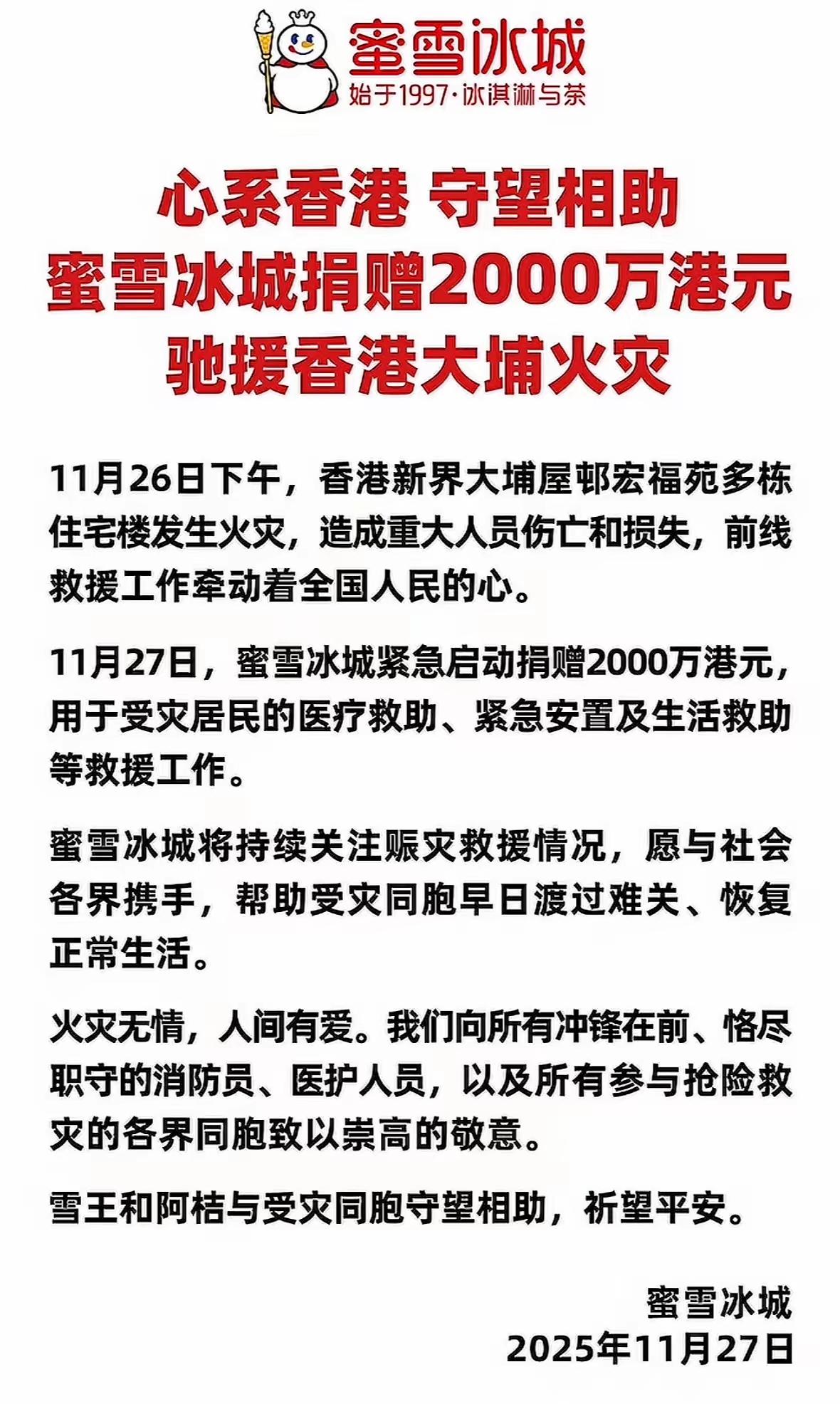 这次香港火灾蜜雪冰城竟然也捐款了2000万! 我经常买2元一个的冰淇淋,这样要卖多少个才够! 怎么香港的富豪明星们没有看见呢?大陆捐款却是冲在最前面,京东,韩红基金,京东,腾讯阿里都捐了。 网友麦当劳、肯德基、沃尔玛、必胜客在中国闷声发大财几十年了,从来都是一毛不拔真是白眼狼。