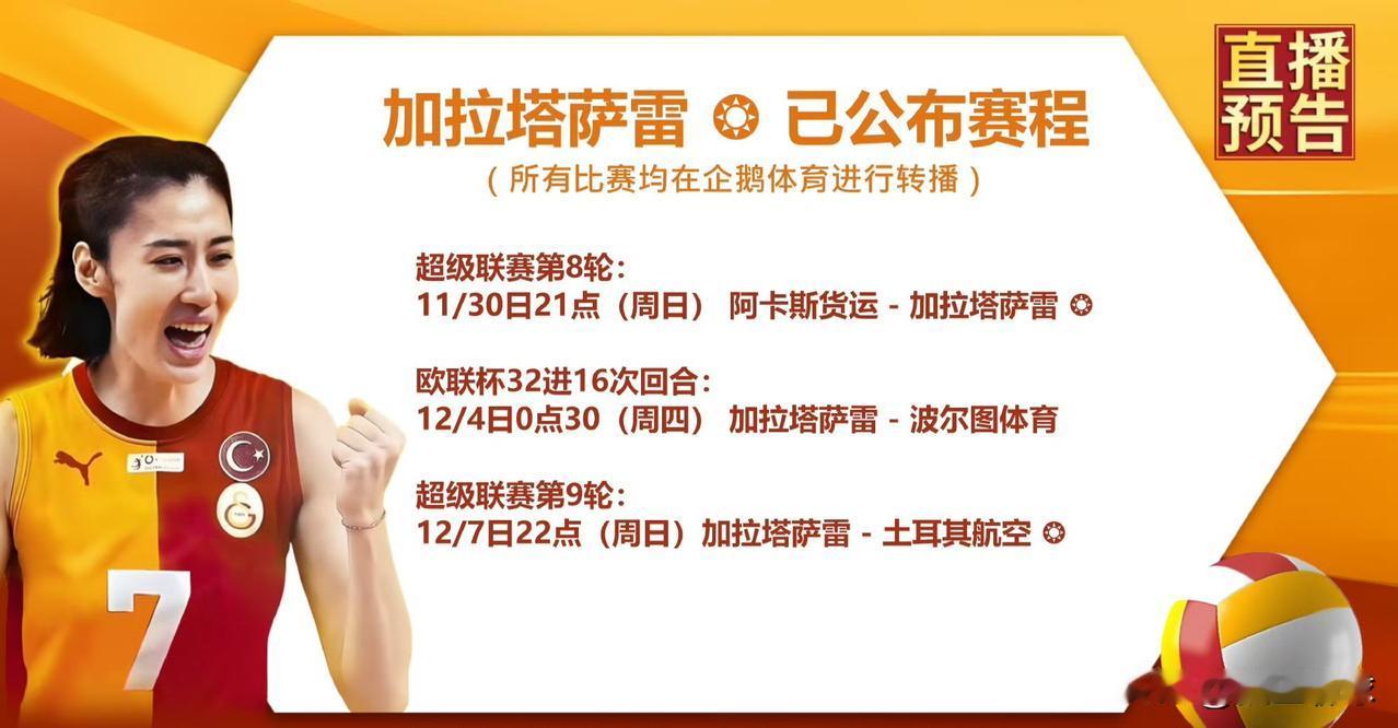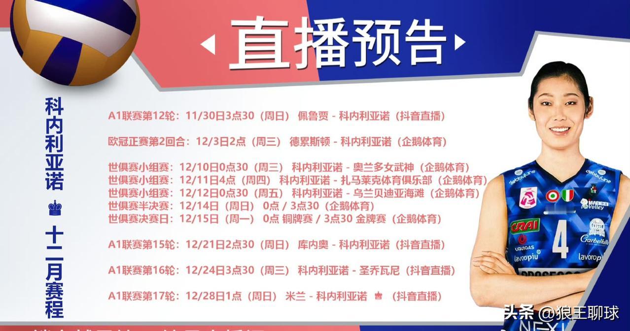 朱婷、王媛媛、庄宇珊加盟的意甲科内利亚诺俱乐部、土超加拉塔萨雷俱乐部、意甲圣乔瓦尼俱乐部12月份赛程已出,具体情况如下图,期待庄宇珊、王媛媛的留洋首秀,李盈莹13月1日到位,体检过身体,合练一周,就有望留洋首秀了吧!加油,精彩的比赛快要来了!