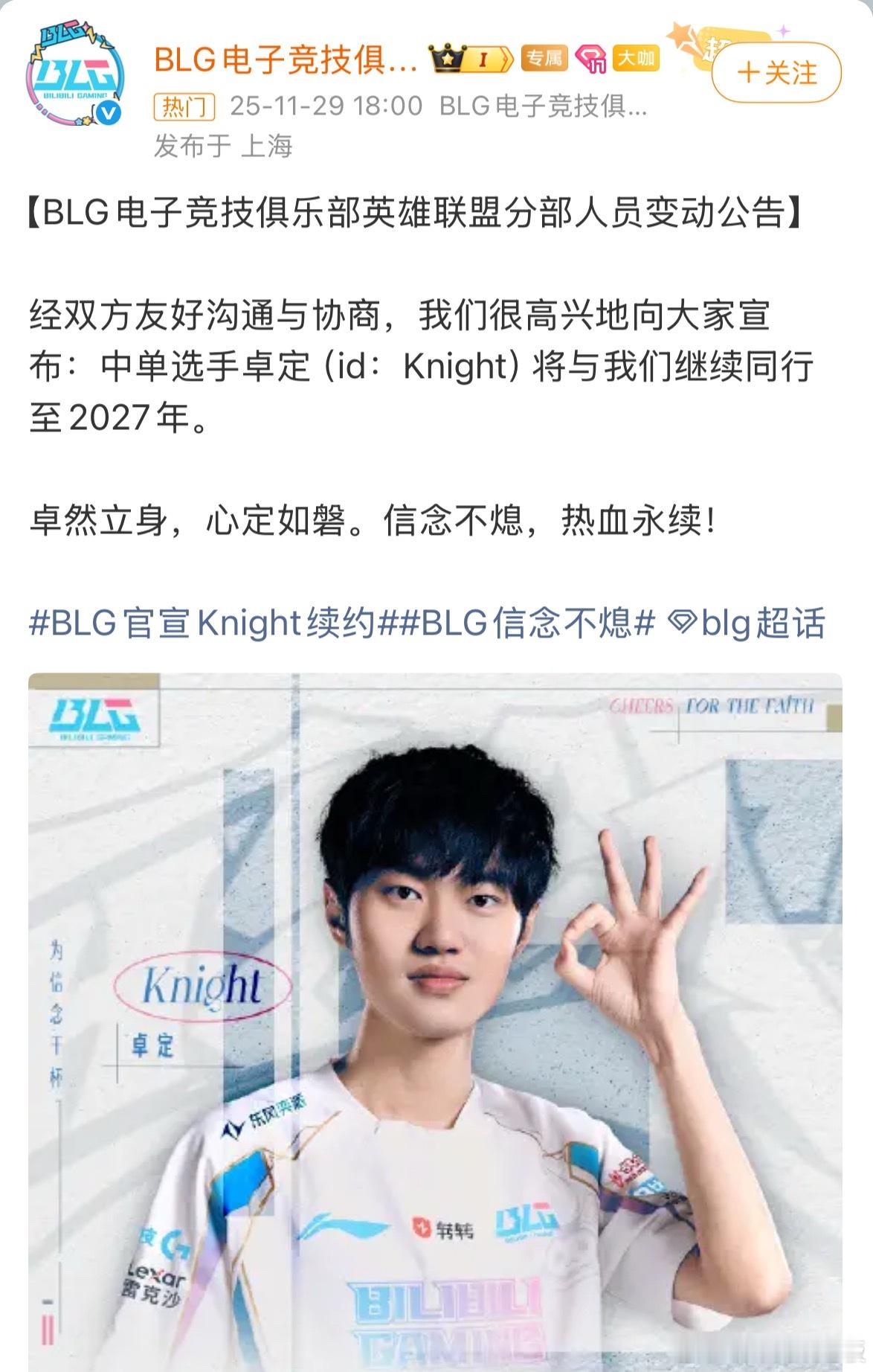 BLG官宣Knight续约官宣!BLG正式锁定核心中单Knight,续约至2027年,同天ON也同步续约。五冠在手的“黄金左手”留守BLG,期待新赛季BLG成绩!