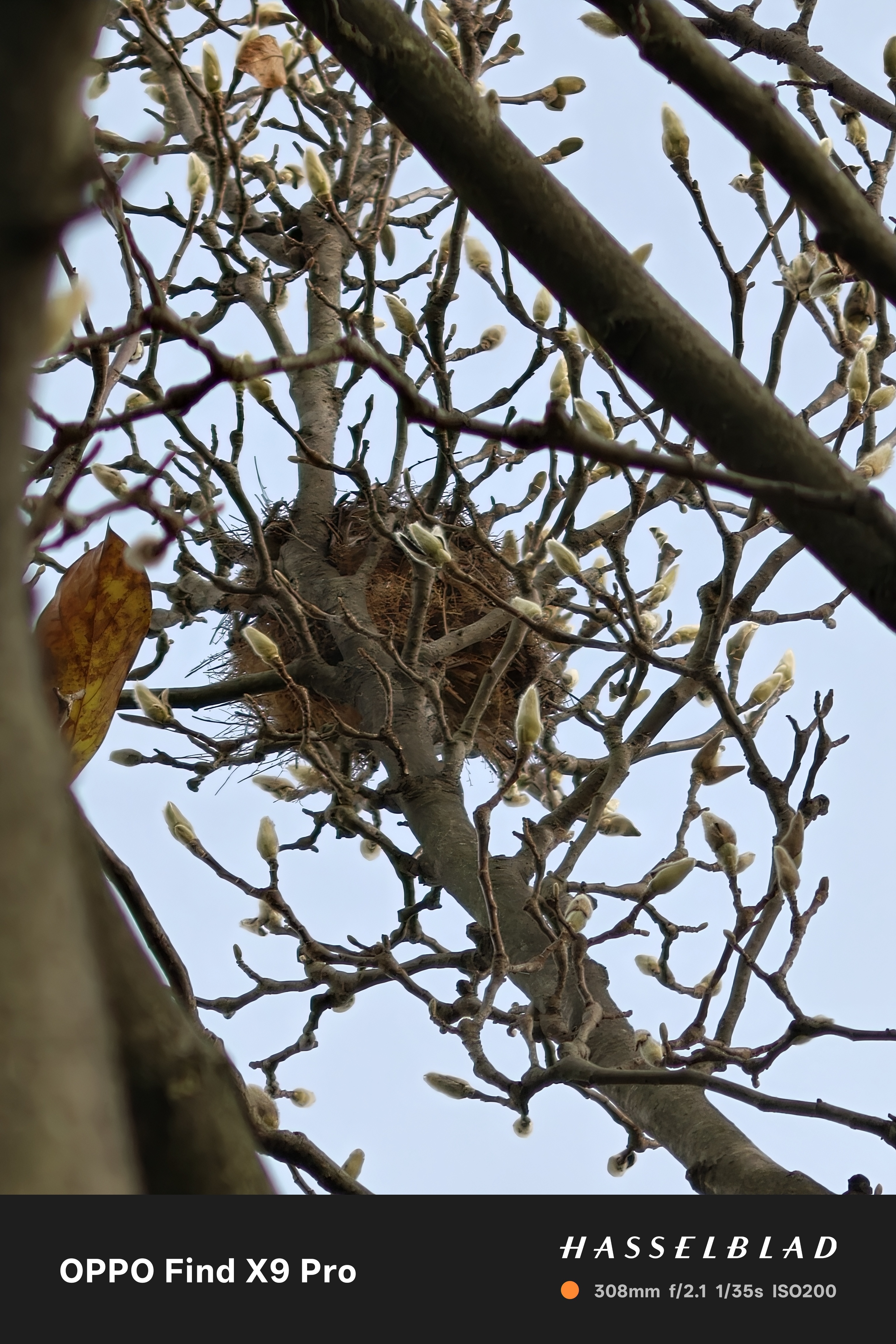 深秋了,白玉兰叶子掉光了,鸟窝好明显满树的花苞,太神奇了~