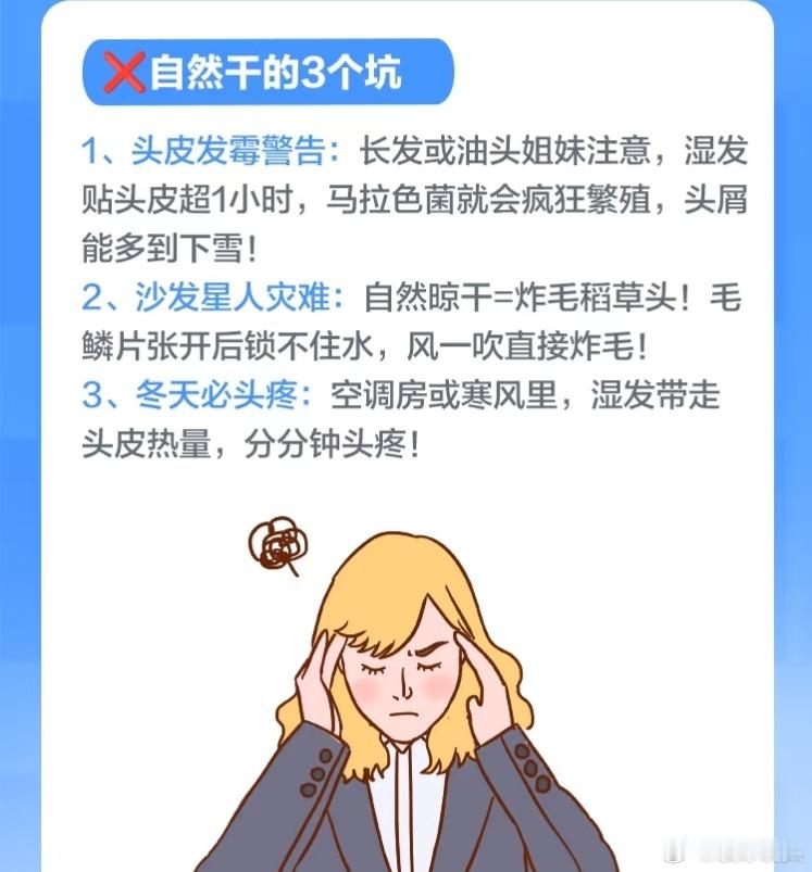 头发自然干vs吹风机吹干洗头发之后一般会用吹风机吹干。让头发自然干,真的很容易着凉,容易头疼。