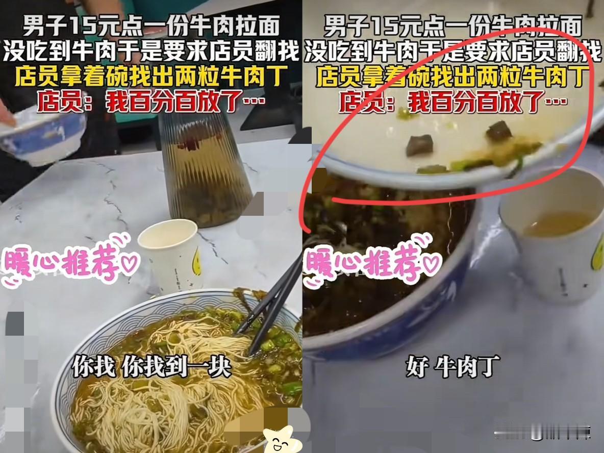 新疆一男子去拉面店吃拉面,面上来后,不料,男子吃了半天没吃到牛肉。找来厨师核对翻找,结果,在碗里翻遍汤底只扒出两粒指甲盖大的牛肉丁,厨师还特笃定:“百分百放了!” 现在不少面馆真是把“牛肉”玩成了“限量彩蛋”,价格从以前的七八块飙到十五块,面条分量没见加,牛肉倒成了“象征性存在”! 成本涨可以理解,但也不能这么糊弄人啊!消费者花的是牛肉拉面的钱,不是白面条配“牛肉味调料包”的价! 餐饮生意拼到最后,拼的从来不是抠门的小聪明,而是实打实的诚意! 要么明码标价“素拉面”,要么少涨点价多放两片肉,别让一碗拉面,把食客的信任都吃没了! ​ 对此,大家觉得我说的对吗?