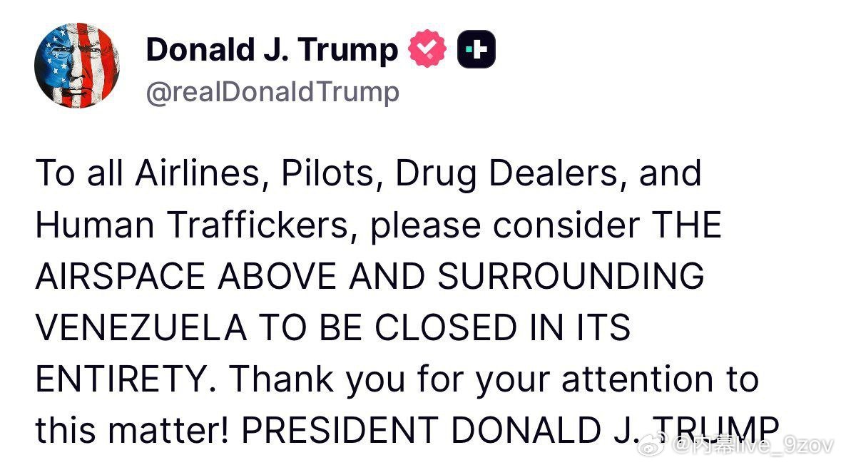 🚨突发:特朗普宣布关闭委内瑞拉领空及周边所有空域。禁止所有“航空公司、飞行员、