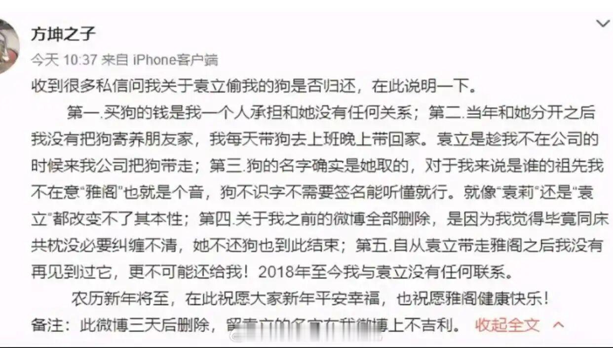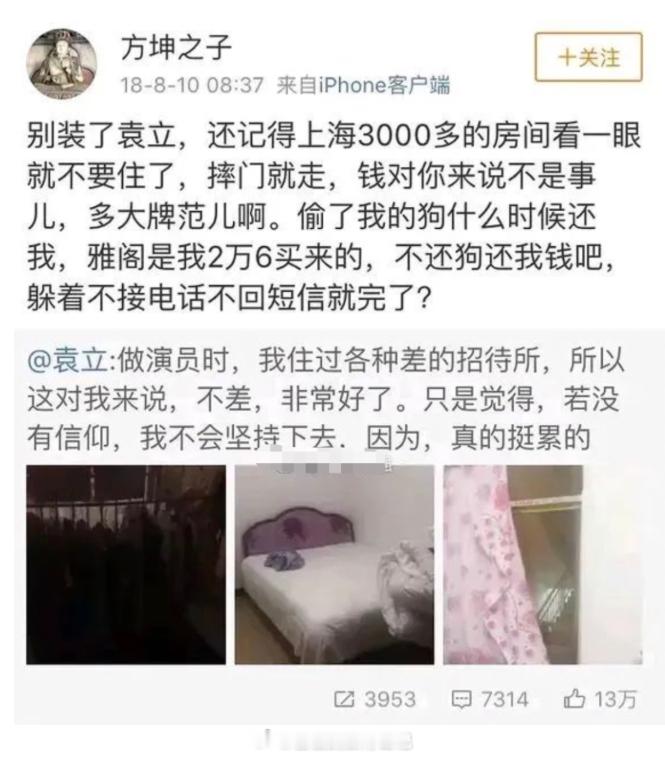 微博往事之袁立发疯(二)提到袁立,大家现在对她印象最深的,就是羊胎素和偷狗。偷狗是咋回事呢?2018年,袁立的前男友发微博,求助网友,找自己的宠物狗雅阁 图1这只狗,是袁立和他恋爱时养的。当时男方自己花钱买的狗,分手后,狗也跟着男方,没想到就这么丢了。过了几天,袁立神奇的被拍到,牵着这只狗。原来是她偷的狗··· 图2男的得知袁立偷狗后,又发微博,说他白天带狗去公司,晚上带回家。某天,袁立趁着他不在公司,偷走了。图3关于羊胎素这个视频(图4),大家可能不知道背后的故事,袁立的行为也很耐人寻味。当时袁立和一位加拿大人结婚,传出怀孕的消息。在新剧发布会上,记者一直追问袁立关于怀孕的事,袁立避而不谈,为了引开关注度,直接来了一句:斯琴高娃老师最近打了羊胎素。把记者的关注度引到斯琴高娃身上…再说回偷狗的事,前男友多次想找袁立要回被偷的狗,袁立已读不回 图5袁立不是以做公益自居吗?多次表示自己住很差的酒店。有天晒了个招待所照片,说这种房间对她来说非常好了。反正就是立人设吧。(其实她的确有做公益,只是没有自己说的那么伟大)结果前男友转发打脸:别装了,上海3000多一晚的房间里看了一样就不要住了,摔门就走! 图6