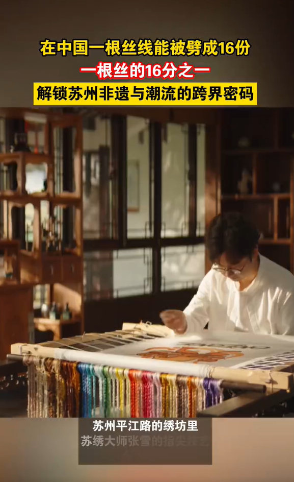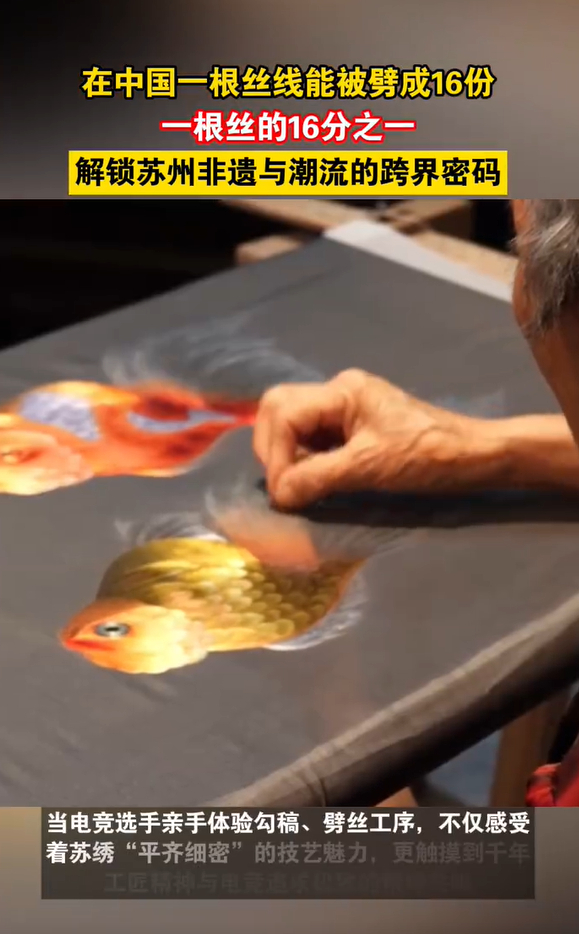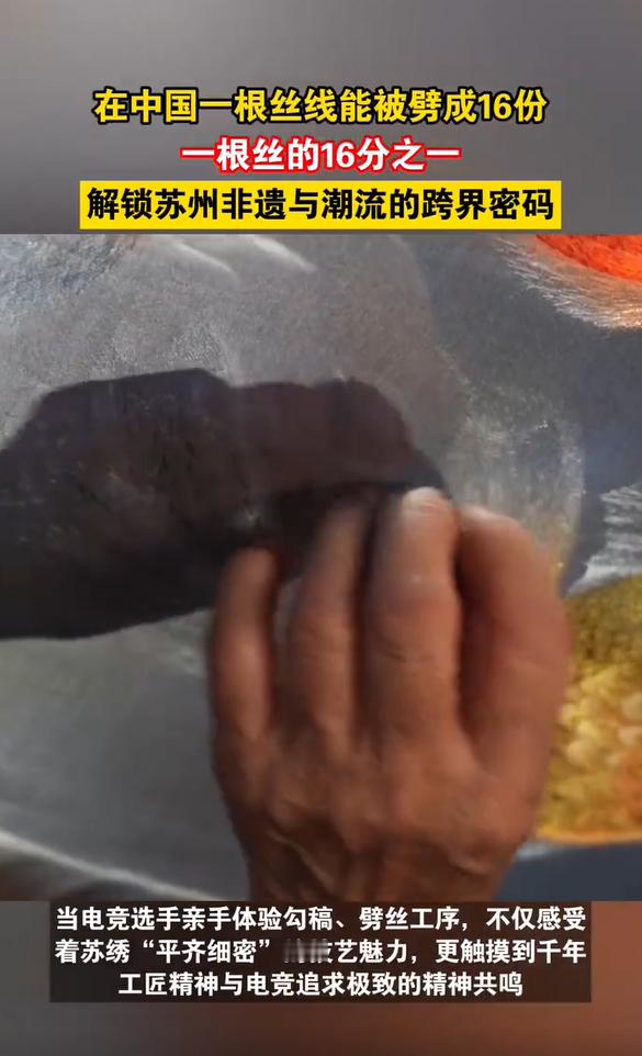 在中国一根丝线能被劈成16份 当苏绣的细腻遇上电竞的火爆!苏绣大师用丝线编织电竞传奇,绣品上的非遗元素成为潮流独特风景,电竞选手的拼搏让这场联动更具热度~