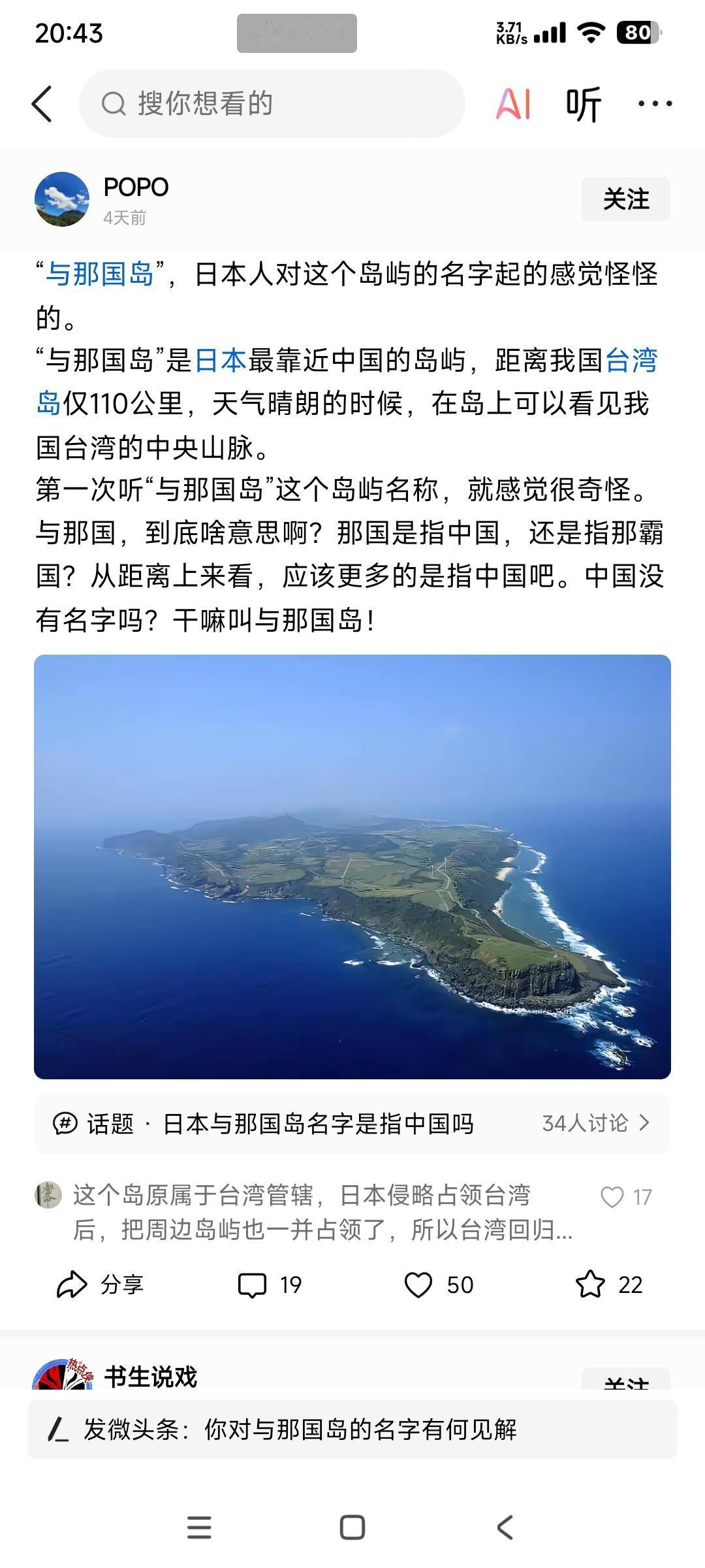 这位博主发文是犯了一个错误 他说:“与那国岛”是日本最靠近中国的岛屿”。 这种说法是错误的,这个岛属不属于日本。 《波茨坦公告》第八条规定,日本主权限于本州、北海道、九州、四国及盟国所决定的小岛,确认了日本领土范围并为战后领土归还提供国际法依据。 琉球群岛不属于日本,与那国岛也不属于日本。 在涉及领土问题,请这位博主仔细查找资料,做到仔细严谨。 日本做为二战战败国,必须严格遵守《波茨坦公告》。