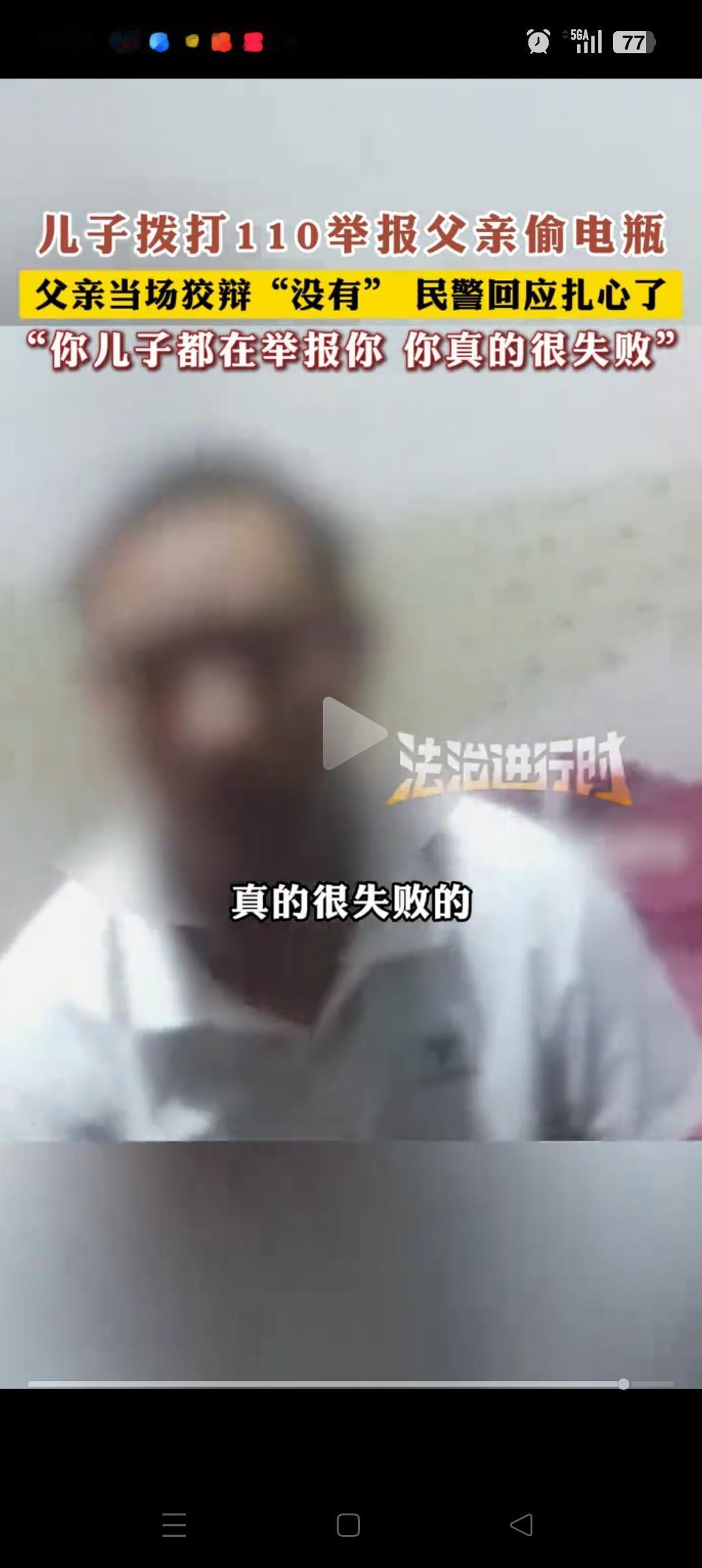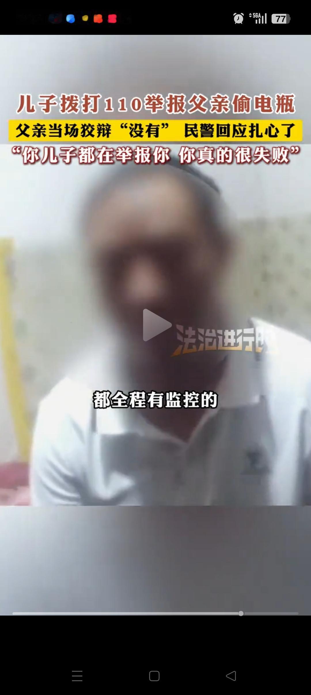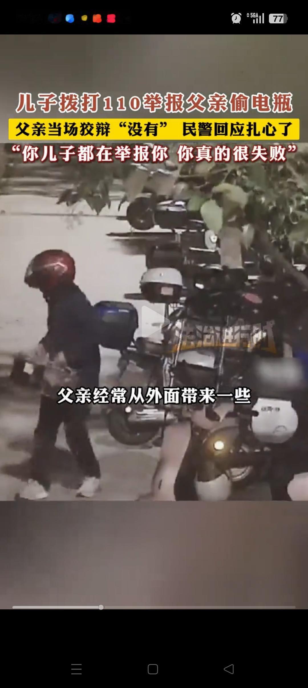 “你儿子都举报你,真的很失败啊”,宁波,一男子打电话给帽子叔叔,举报自己父亲长期偷电瓶。帽子叔叔到达现场后,一句话让男子尴尬了!他说:站在我的角度来看,你儿子都举报你,真的很失败啊。 听声音,男子年纪应该也不小了,也是长期看到父亲这么做,没办法才举报的。(估计之前劝说过,但不听) 从另一个角度来看,这位父亲虽然做人有点瑕疵,但是教孩子还是不错的,起码他能分清楚是非对错,即使对象是父亲,也一样。 希望他们两父子事后,不要因为帽子叔叔这句话而不和,毕竟帽子叔叔说的话也在理啊[捂脸][捂脸]
