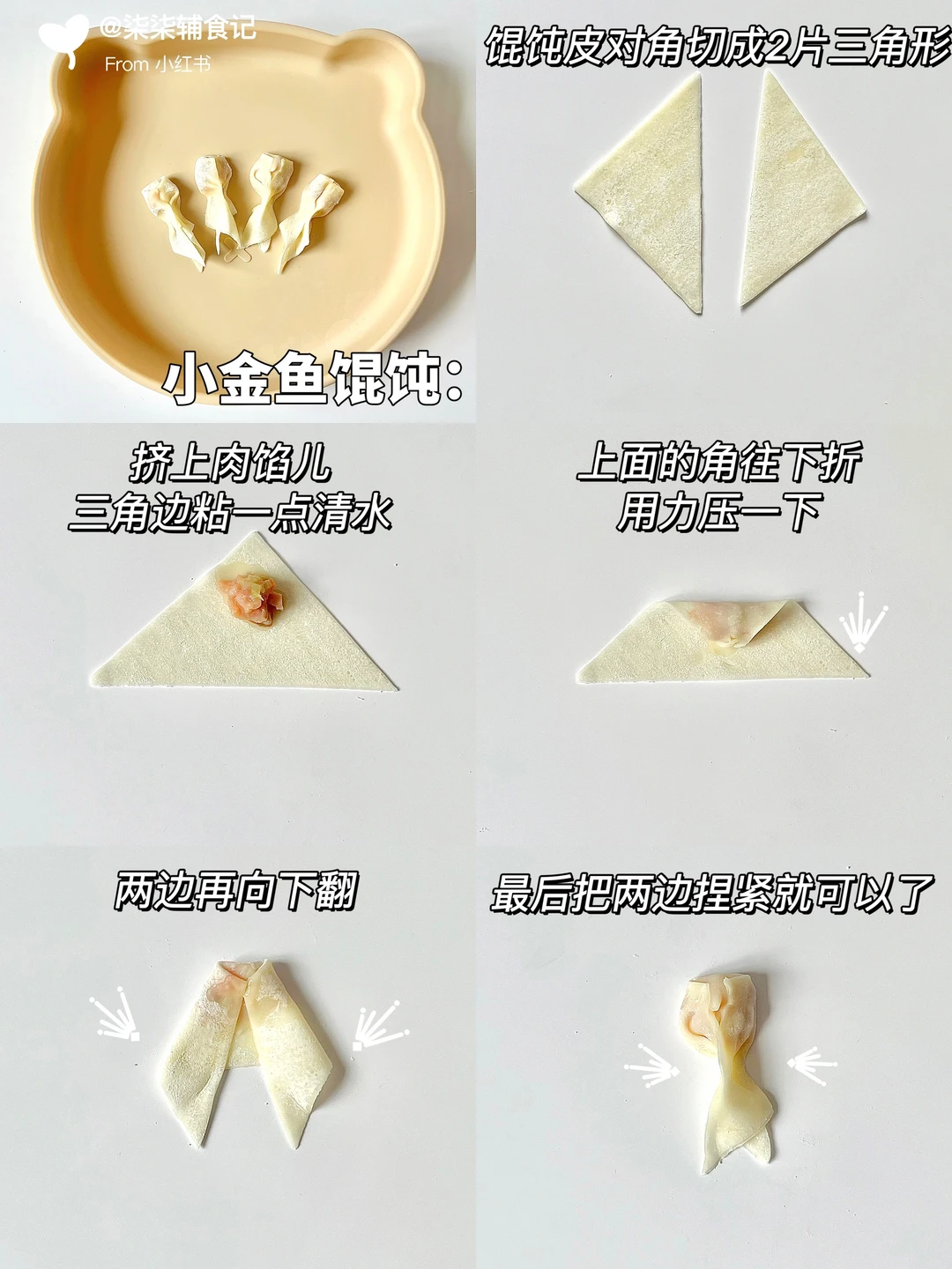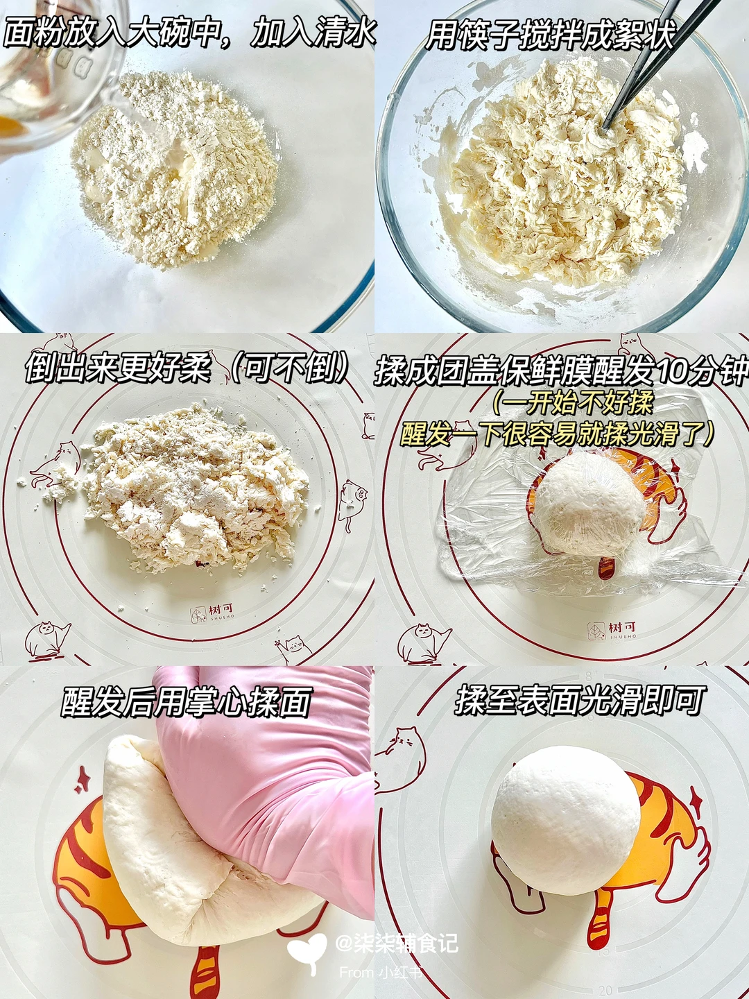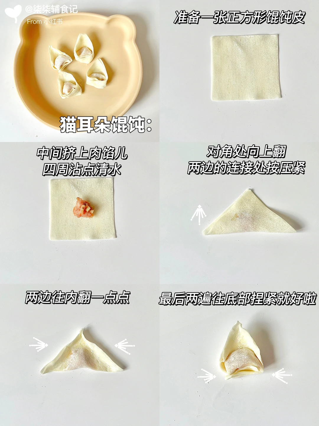 在面购买的馄饨皮总是担心添加太多盐碱,要买无盐无碱的馄饨皮太难啦~ 索性就自己动手制作吧~没想到一次就成功啦!这就来给大家分享制作方法,超简单,一次就能成功拿下~ 🛒食材准备: 中筋面粉100g、清水50ml (需要多做一点的姐妹可以食材加倍) 🧑‍🍳制作过程: ▫️面粉倒入大碗中,加入清水,边倒边搅拌 ▫️搅拌成絮状倒出来揉面垫上揉会更轻松 ▫️揉成团后盖保鲜膜醒发10分钟(刚开始不好揉,醒发一下揉的更光滑) ▫️醒发后用手腕处揉面,揉成光滑的面团,再次盖保鲜膜醒发20分钟 ▫️醒发好后分成2份,撒上面粉擀开,不停撒面粉擀成薄片 ▫️分成均匀的小方片就完成啦 💡四种小馄饨包法:具体步骤参考图片,有详细说明。(第6-9张图) 但是最后我还是喜欢用模具,一按一压就能做出2个小馄饨,造型还很可爱,柒柒胃口更好啦! 🔺擀皮的时候一定要不停撒面粉,不然会很粘 🔺切好的馄饨皮两面也要均匀撒上面粉,不然放久了还是会粘在一起