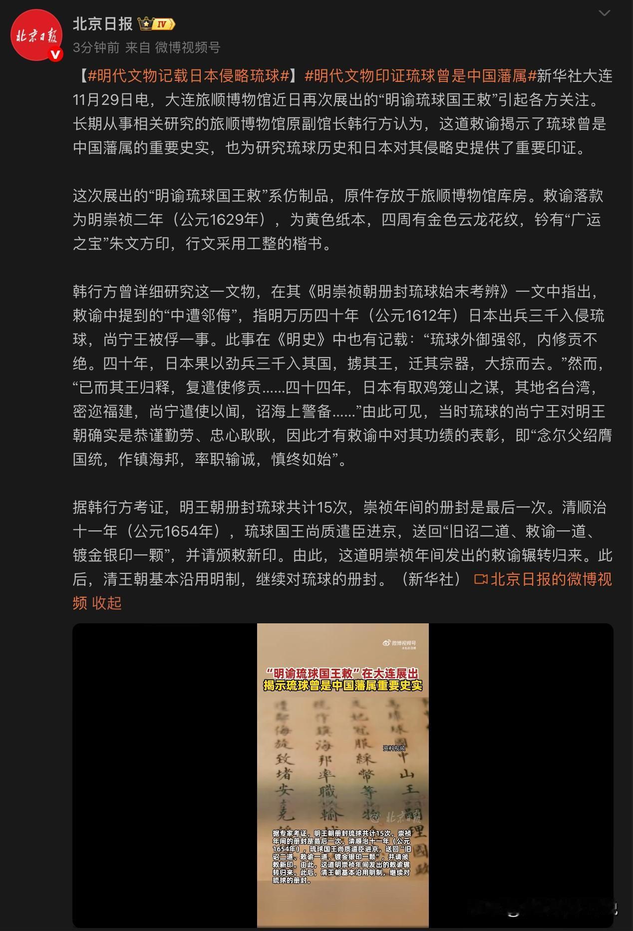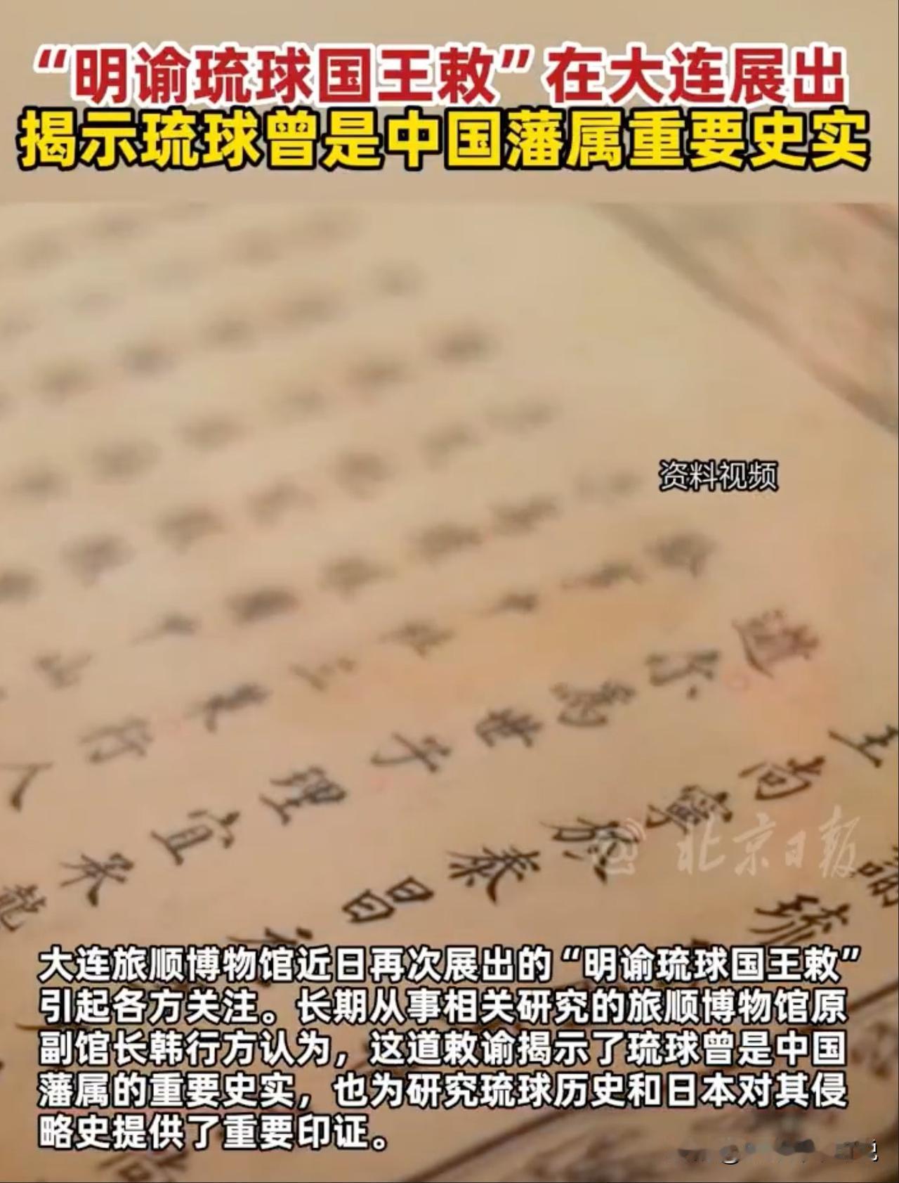 看来琉球适用“自古以来”完全没毛病,这真的是有历史依据的!大家可以去查查《明谕琉球国王敕》这份诏书,上面清清楚楚记载了崇祯皇帝敕封琉球的内容,大概内容是:1. 告知已收到尚丰因其父尚宁去世请求承袭王位的奏章。2. 正式派遣使臣(杜三策、杨抡)前往册封尚丰內新王,并赐予冠服、彩币等礼物。3. 表彰先王尚宁恪尽职守、对明王朝忠诚的功绩。4. 告诫新王尚丰要遵守藩属职责,治理好国家,保卫疆土。看见没?相信只要理解能力没问题的人都能看出,琉球在大明时期的归属问题!所以,用自古以来形容琉球没毛病吧?