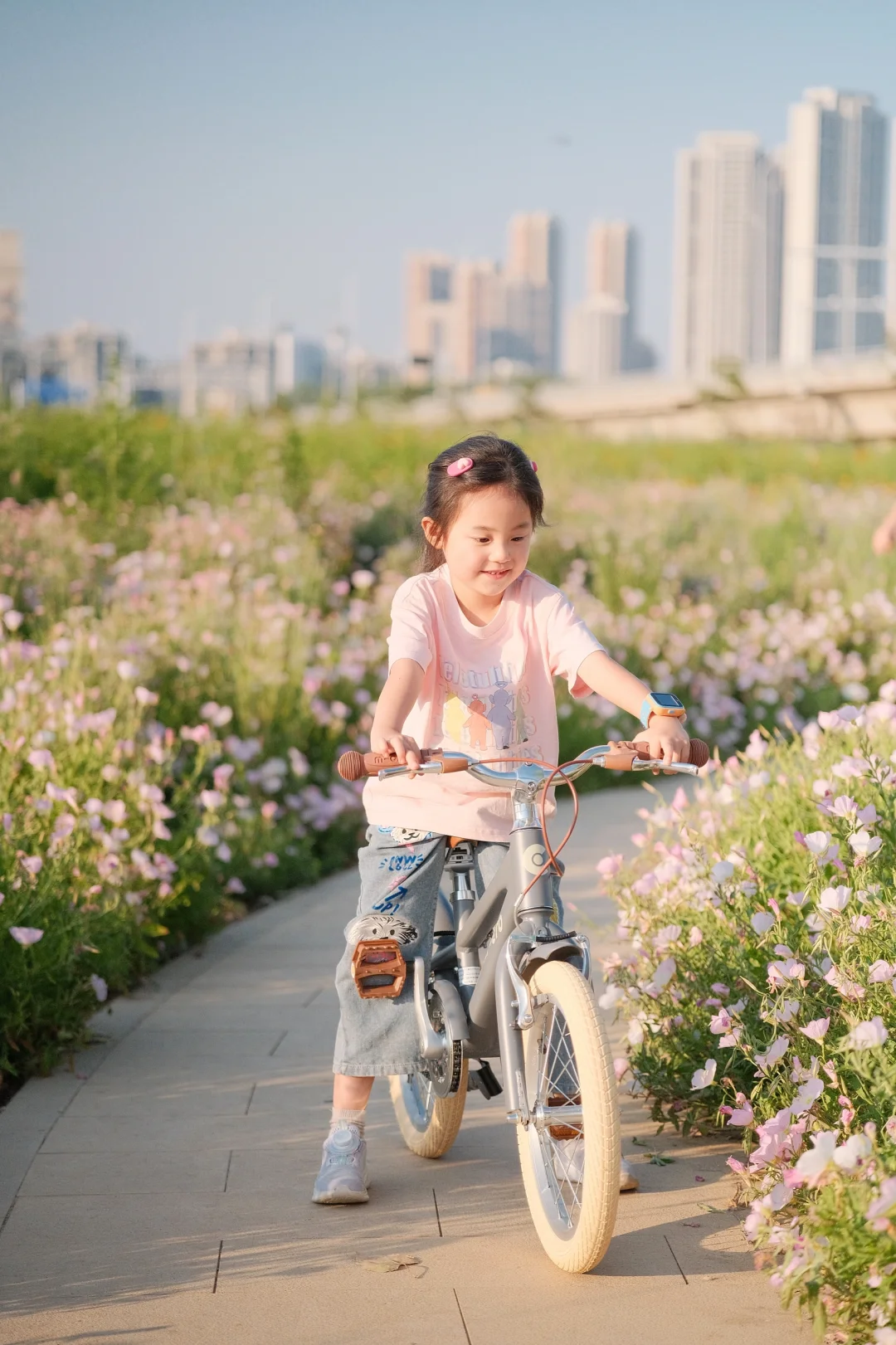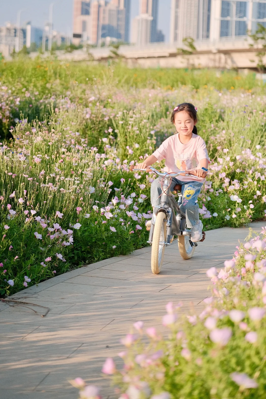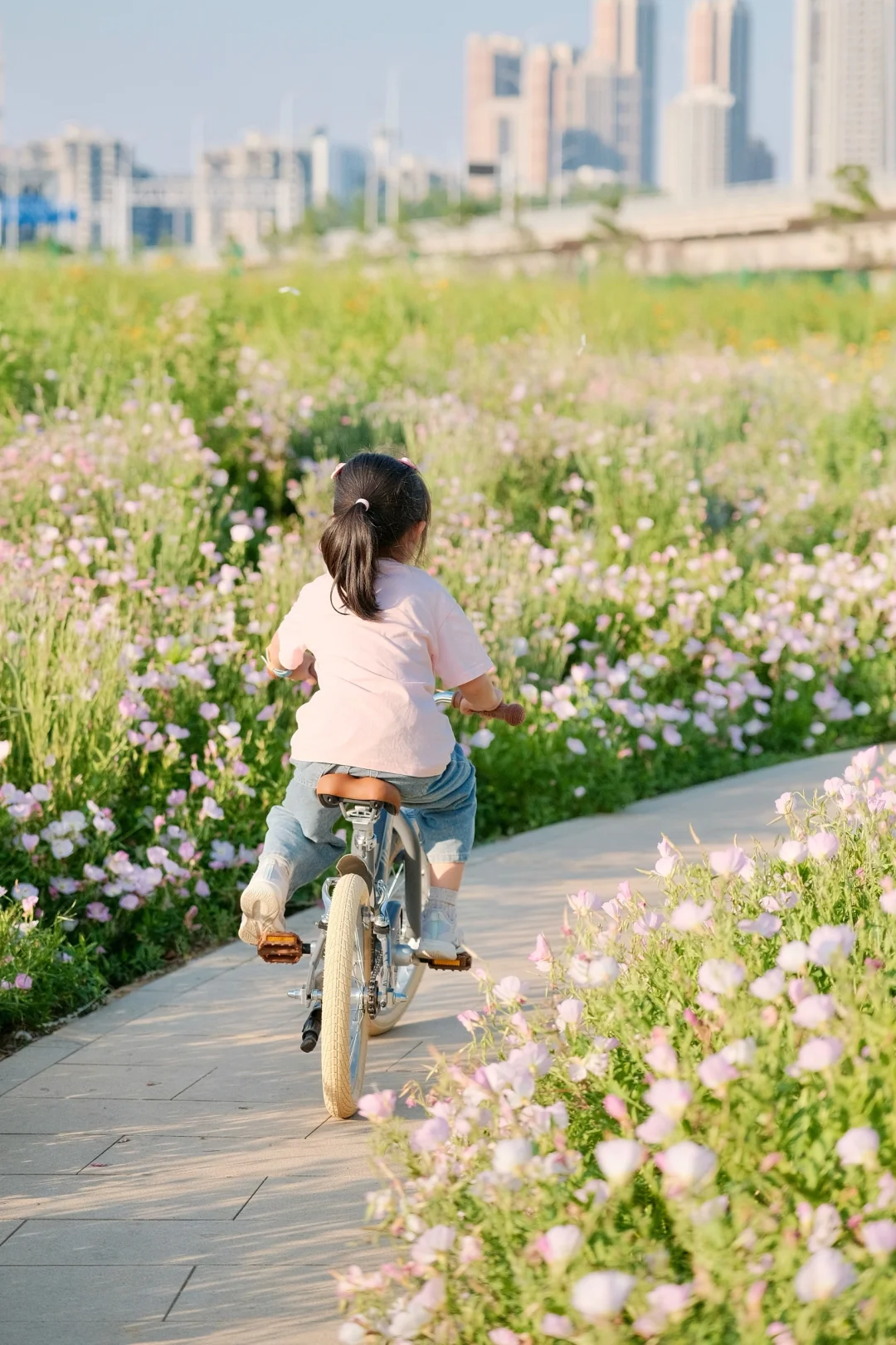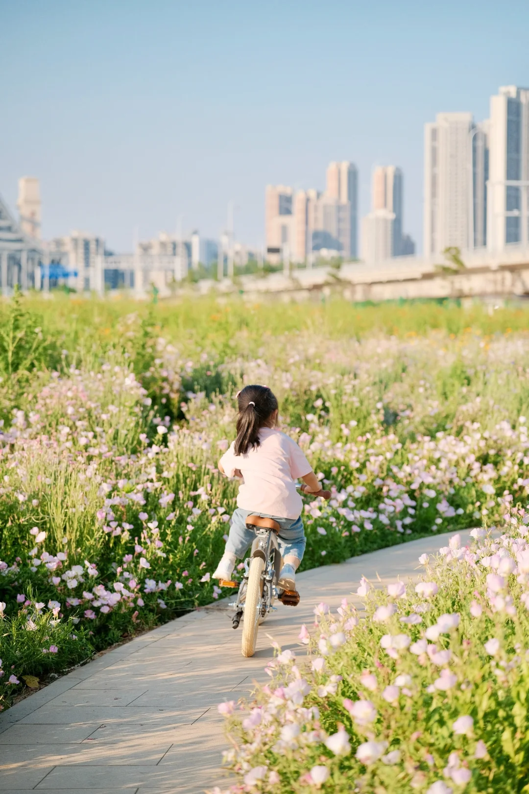 初夏的武汉真的绝美 天气超舒服! 宝贝最近迷上了骑行 当然得带她来打卡绝美花海呢 汉江湾花田花海[搜索高亮]开满了红的粉的黄的花花 5🈷️的月见草花还开的正艳 - 宝贝在花海中骑上了欧式复古风的自行车 奶油色系超温柔,和花海绝配 车子自带的辅助轮,不怕宝贝不会我们骑行了一个月已经学会了 直接给它卸了小轮子🛞 一体成型的马鞍座骑很久小屁屁都不痛啦 - 在3万方的花海中,享受风和自由 周末带娃骑行的快乐🎉谁懂呀