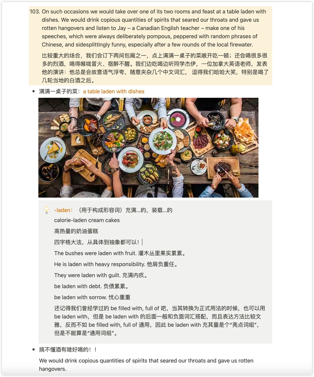 还记得我们曾经学过的 be filled with, full of 吧,当其转换为正式用法的时候,也可以用 be laden with,但是 be laden with 的后面一般和负面词汇搭配,而且表达方法比较文雅,反而不如 be filled with, full of 通用。
