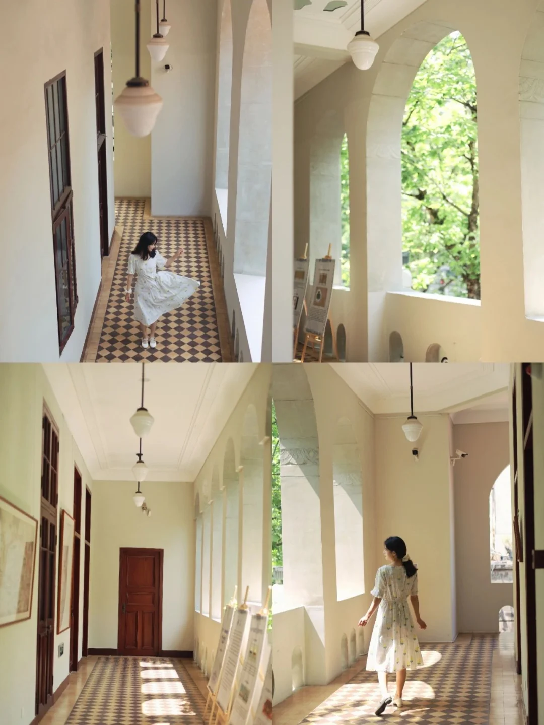 🍃超出片的百年洋房,魂穿法国,整体风格很复古,几何图案拼花地板,拱形窗户搭配梧桐好像一幅画,可以在这里感受历史文化