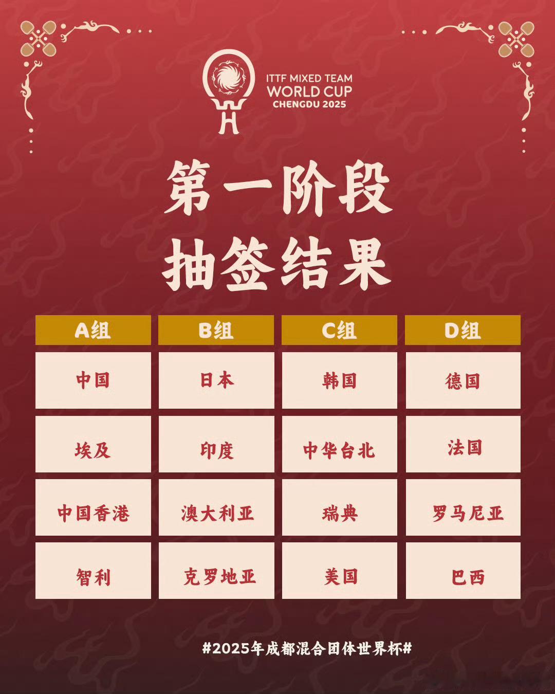 2025年成都混合团体世界杯第一阶段抽签结果A组:中国、埃及、中国香港、智利B组:日本、印度、澳大利亚、克罗地亚C组:韩国、中国台北、瑞典、美国D组:德国、法国、罗马尼亚、巴西每小组前二出线,C、D组内竞争激烈王楚钦孙颖莎揭晓1号签位