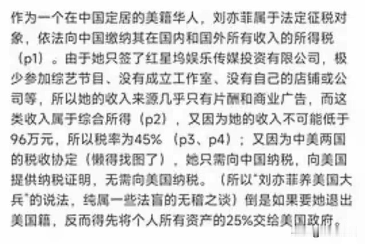 刘亦菲因为是🇺🇸国籍,收入税收是45%,就是假设拍部戏1000w,她要交税450w。 这样好啊,要不然拿着美国的福利,又来站着中国的资源。 要是军嫂就就是另外的待遇。军嫂有创业三年免税政策,难怪张馨予婚后,接活少了,就是在家种菜,做饭。肯定的,不想占国家政策便宜。 她要是开公司或工作室,然后疯狂接戏代言,出综艺,三年免税就能进账几亿。 但是作为军嫂,她可丢不起那个脸。