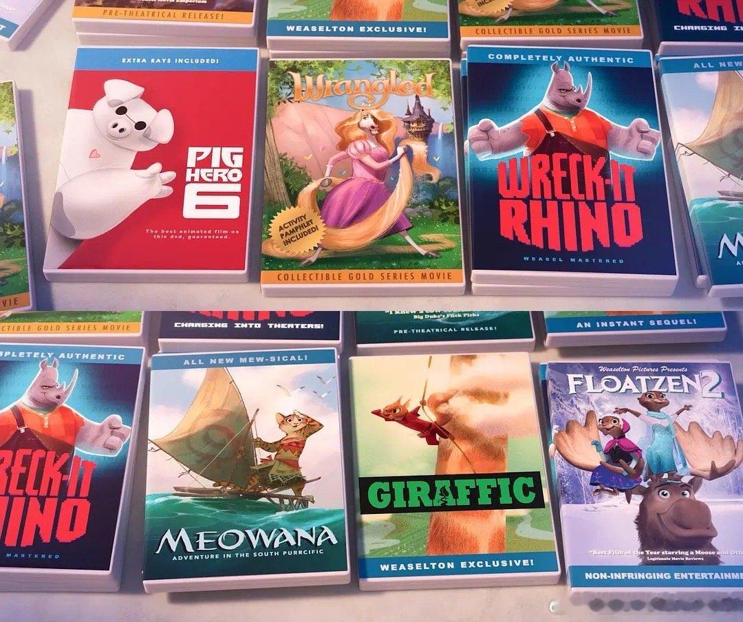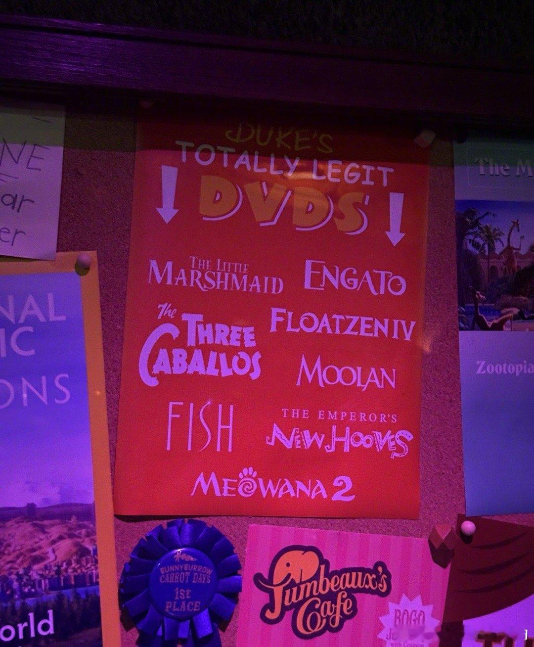 《疯狂动物城》里卖盗版碟的黄鼠狼公爵到第二部还在卖碟,这次还有一句经典的调侃“续集,前传,炒冷饭,谁说电影行业完了?”【自嘲梗永远都很好笑节目单上有《小美人鱼》《魔法满屋》《三骑士》《冰雪奇缘4》《花木兰》《星愿》《变身国王》《海洋奇缘2》疯狂动物城佳片奇遇季