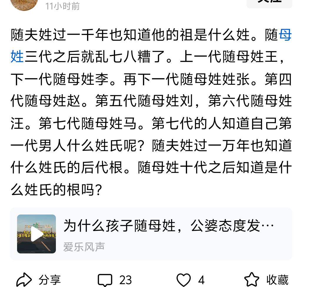 随父姓再过1千年也知道,自己的祖先姓什么。随母姓三代之后就乱七八糟了! 这种说法,就是典型的男尊女卑思想在作祟!能提出这种说法的人从来就没有把自己的女性祖先当成自己的祖先,也没有把自己的女性后代当成自己的后代!