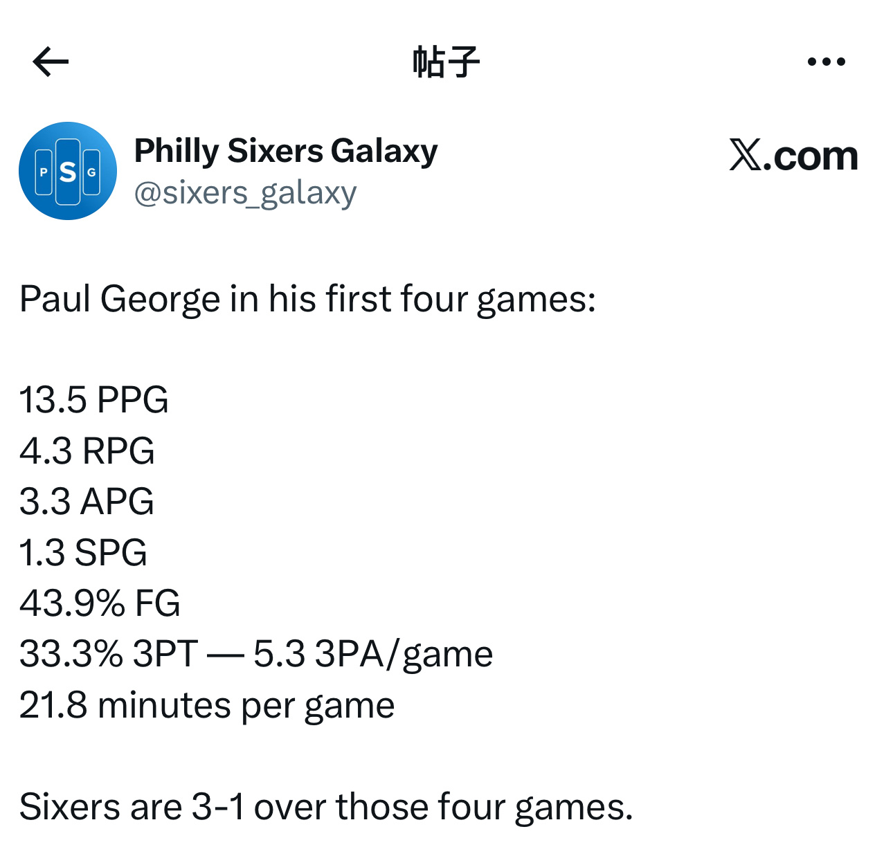 赛季至今,保罗·乔治出战四场比赛的数据如下:场均13.5分,4.3个篮板,3.3次助攻,1.3次抢断,投篮命中率43.9%,三分命中率33.3%(场均出手5.3次三分),场均上场时间仅21.8分钟!费城76人队在这四场比赛中,取得3胜1负的战绩!费城76人新赛季篮不住PaulGeorge保罗乔治