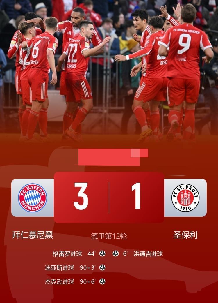 德甲-拜仁3-1补时逆转圣保利 迪亚斯传射,杰克逊建功 11月30日 ,11月29日晚22时30分,德甲第12轮,拜仁慕尼黑主场迎战圣保利。上半场洪通吉破门+伤退,格雷罗扳平比分,下半场,补时阶段,迪亚斯和杰克逊连入2球反超。最终,拜仁主场3-1逆转圣保利,拜仁积34分以8分优势领跑