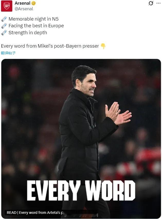 阿尔特塔出席了赛后新闻发布会,我们来看看阿森纳主帅的发言。关于缩小和欧洲顶级强队的差距:我们目前在欧冠的表现确实非常稳定,但这只是开始。我们对今天看到的一切感到满意,球场里创造出的气氛和我们传达出的活力以及比赛质量都让人赞叹,我们必须保持这点,因为这还在早期阶段。不幸的是,我们必须每三天就做到这点,当然这也是美妙之处。今晚的胜利对你们来说有多重要?拜仁是一支顶级球队,我认为他们可能20或者21场不败了吧,你们也看到这些纪录了,所以你们也知道比赛的难度。这场比赛我们做到了,这很好,这展示出了球队能做到什么,而且我也对今天获得机会的球员很满意,他们的出场带来了巨大的影响,这正是我们需要的。你能谈谈阿森纳阵容深度的优势吗?我认为我很开心,但当我看向拜仁的替补席时,情况是一样的。我看到他们替补出场的球员,也是那些能改变比赛的球员。我们显然提高了阵容深度,不仅是球员的质量,还有他们的心态,而这给我们带来了很大的不同。特罗萨德什么情况了?我们还不知道,他说他感觉到了什么,我们不想冒险。鉴于你们四线争冠赛程密集,你们是否有尽快确保出线资格的目标?显然,在任何赛事中都是越快达成这个目标越好。但我们也知道其中的难度,球队前面还有非常困难的比赛等着我们,不过我们确实处在很好的位置上。你是如何在莫斯克拉和因卡皮耶之间作出决定的?莫斯克拉今天表现也很好:是的,我认为莫斯克拉表现很好,因卡皮耶也一样。我们必须清楚,因卡皮耶是从厄瓜多尔赶回来的,他踢了两场全场。然后又踢了德比战,这是因卡皮耶在英超的第一次首发,那场比赛之后他非常疲劳,好消息是我们还有莫斯克拉,他今天和萨利巴都表现很好。两年前你们在四分之一决赛输球,你认为这支球队和当时那支球队有何不同?我们不一样了,他们也不一样了,而且这是赛事的不同阶段。其实那年我们出局时两回合差距也不大,但那就是历史。希望我们学到了教训,变得更强大了,并且在未来展示出这点。