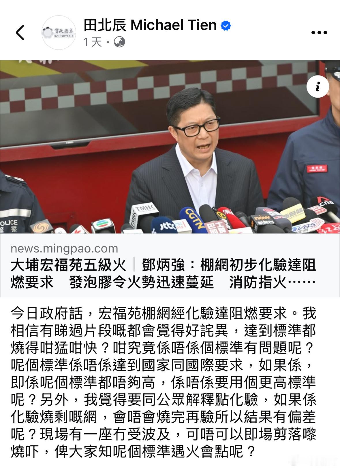 居然田议员有质疑,也很应该做多次实验去给大家看,不止要做,还要从物理、化学角度去解释好,消除疑虑。不然很多像田议员一样的市民,会有这样那样的不解。真的假不了,假的真不了,免得给人家认为香港的保安局、消防处、警务处、房屋局、政府化验所联合起来说谎就不好啦。香港举行悼念活动此前失踪名单中144人确认安全香港大埔火灾已致128人遇难香港火灾港闻热点观点