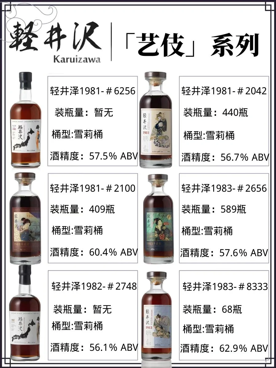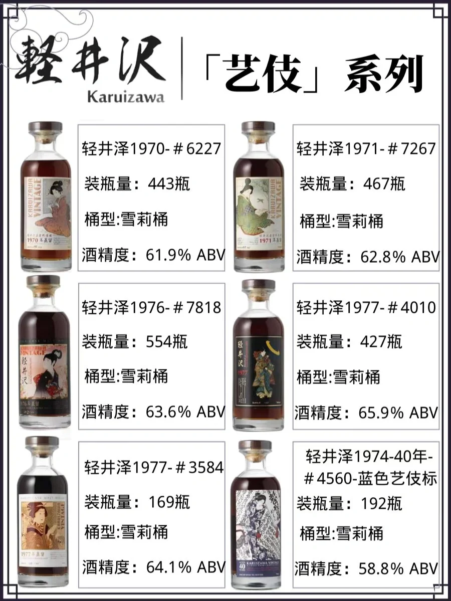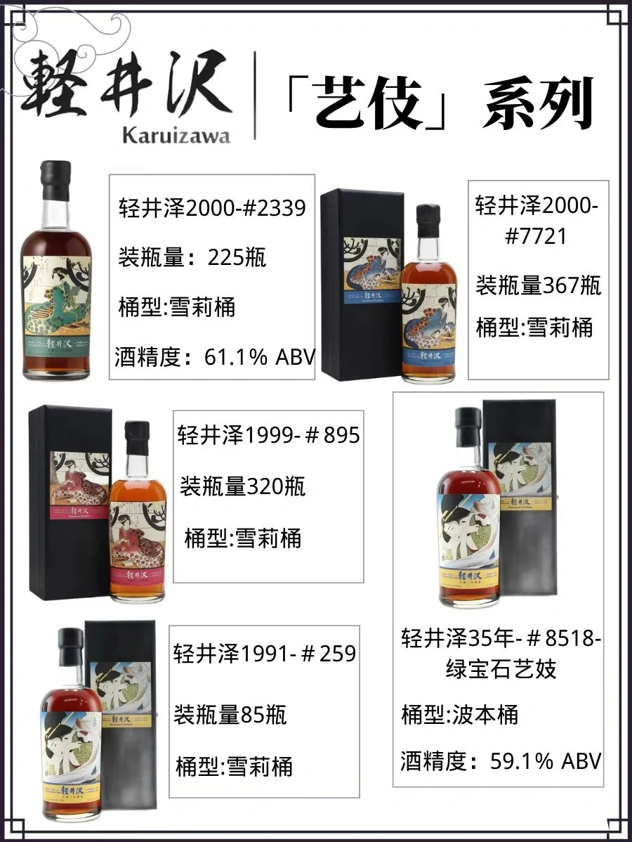 🔞艺妓系列:『艺妓』是轻井泽最主要合作的装瓶公司『一番』推出的一个系列,一番挑选某些单桶瓶装的轻井泽,使用不同的日本艺妓肖像印在酒标上。