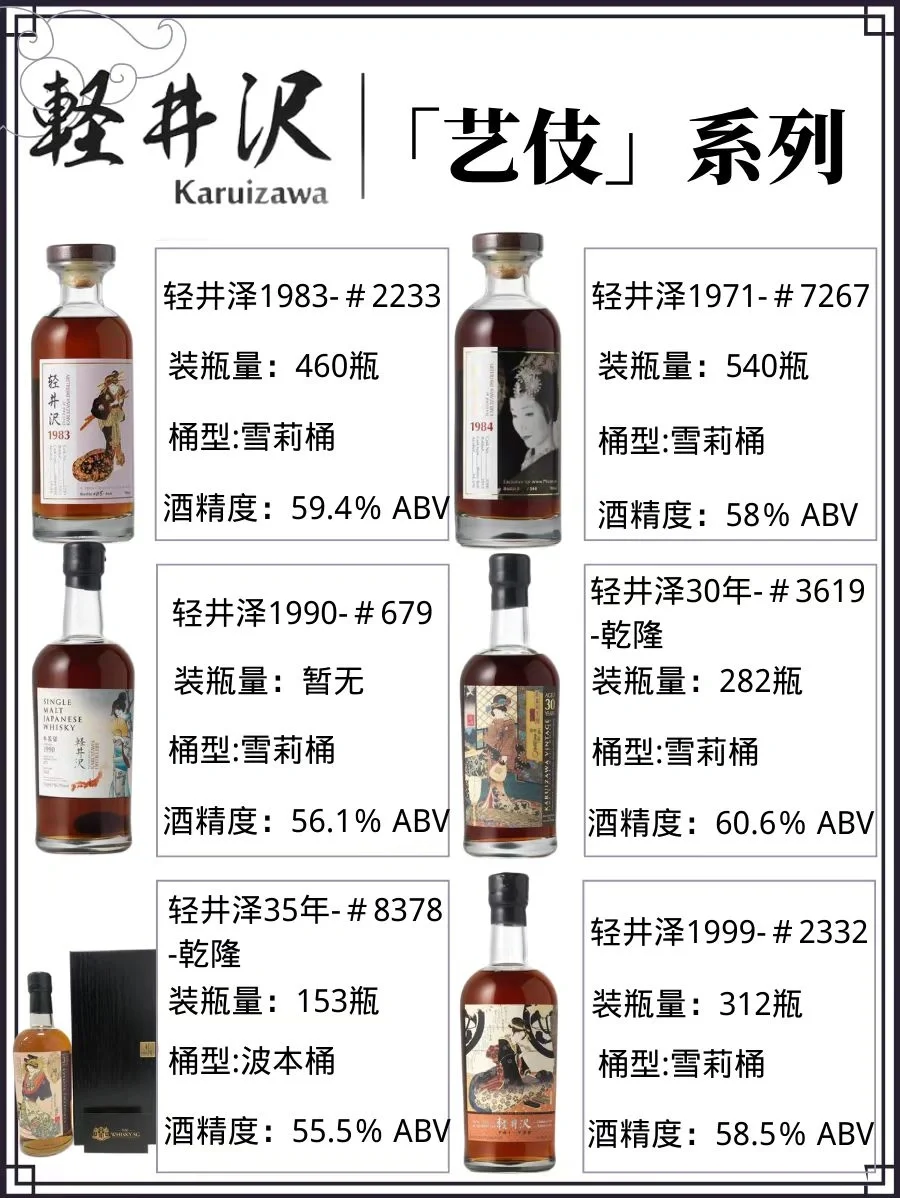 🔥如果必须挑一个传奇的威士忌品牌,『轻井泽威士忌』肯定会是大多数行家的首选。轻井泽拥有一切梦幻逸品的条件:数量稀少、品质极高、单价极高、知名度极高~ 🔞艺妓系列:『艺妓』是轻井泽最主要合作的装瓶公司『一番』推出的一个系列,一番挑选某些单桶瓶装的轻井泽,使用不同的日本艺妓肖像印在酒标上。 💢其实严格来说艺妓不能算是一个系列,因为它使用的酒款、年分、价格都没有统一的挑选标准,发行的数量也不统一,主要是因为标签非常有特色,就被酒友当成一个系列了。 🌼日本艺伎产生于17世纪的东京和大阪,最初的艺伎全部是男性,之后才被女性艺妓取代。传统的艺伎是一种表演艺术,不是卖弄色情,更不卖身。 🎋艺妓是日本传统文化的象征之一,因此一些威士忌酒商或独立装瓶商,将轻井泽的酒款搭配上绘有艺妓的酒标,将日本文化和威士忌融为一体,推出一系列“艺妓标”版轻井泽。 🌾近几年来,轻井泽艺妓标系列在拍卖会上常常以高价售出,成为威士忌收藏界的抢手酒款。 🎋有一说一,艺妓酒标的设计确实独特精美,大多采用浮世绘的风格,线条简洁,色彩明丽,配色大胆,有着日式传统审美的风韵。 🎉艺妓系列的轻井泽拥有变化多段的酒标,有写实的也有手工绘制的,使得酒标不单一,各有各的特色,就像女人👩🏻一样,你总能找到你偏爱的女子。