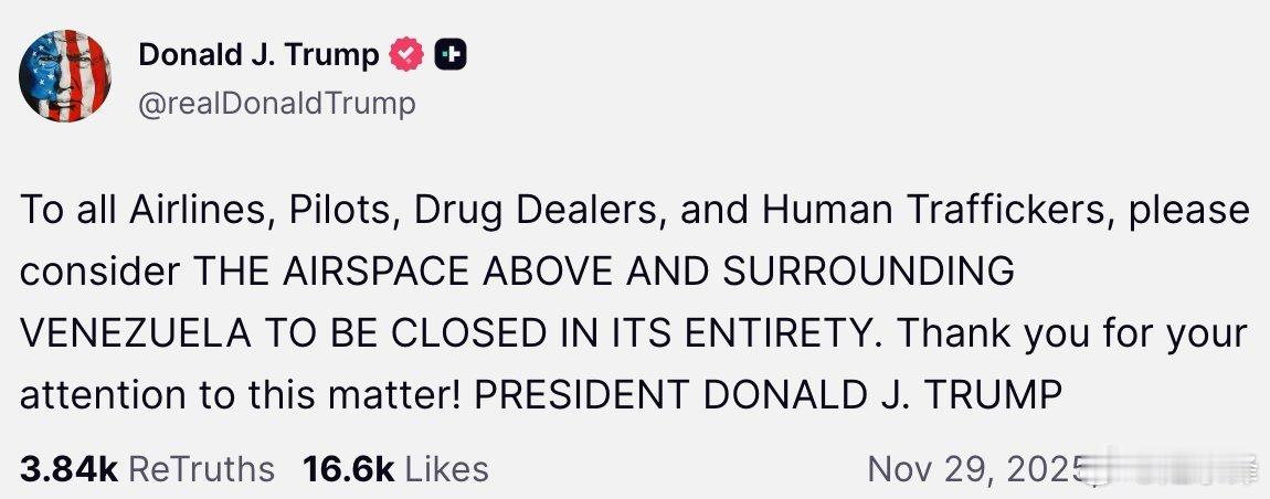 特朗普:“致所有航空公司、飞行员、毒贩和人口贩子,请务必将委内瑞拉上空及周边空域视为已被彻底关闭。”彭博社记者分析称,这是美国可能采取某种行动或打击的最新信号。