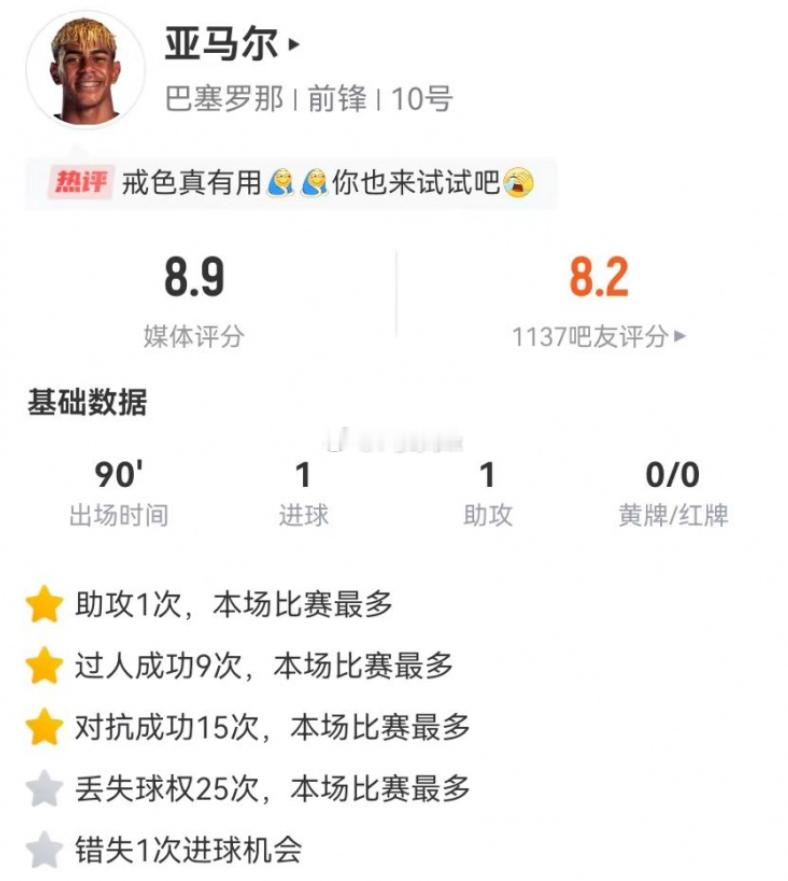 巴萨在本轮西甲3-1逆转阿拉维斯,亚马尔本场数据如下:首发踢满全场1球1助攻7射1正1中框1错失进球预期进球0.6915过人9成功93触球56传球,成功率73.2%1关键传球1长传、0成功3抢断22对抗、15成功3造犯规获评8.9分巴塞罗那3-1阿斯维拉