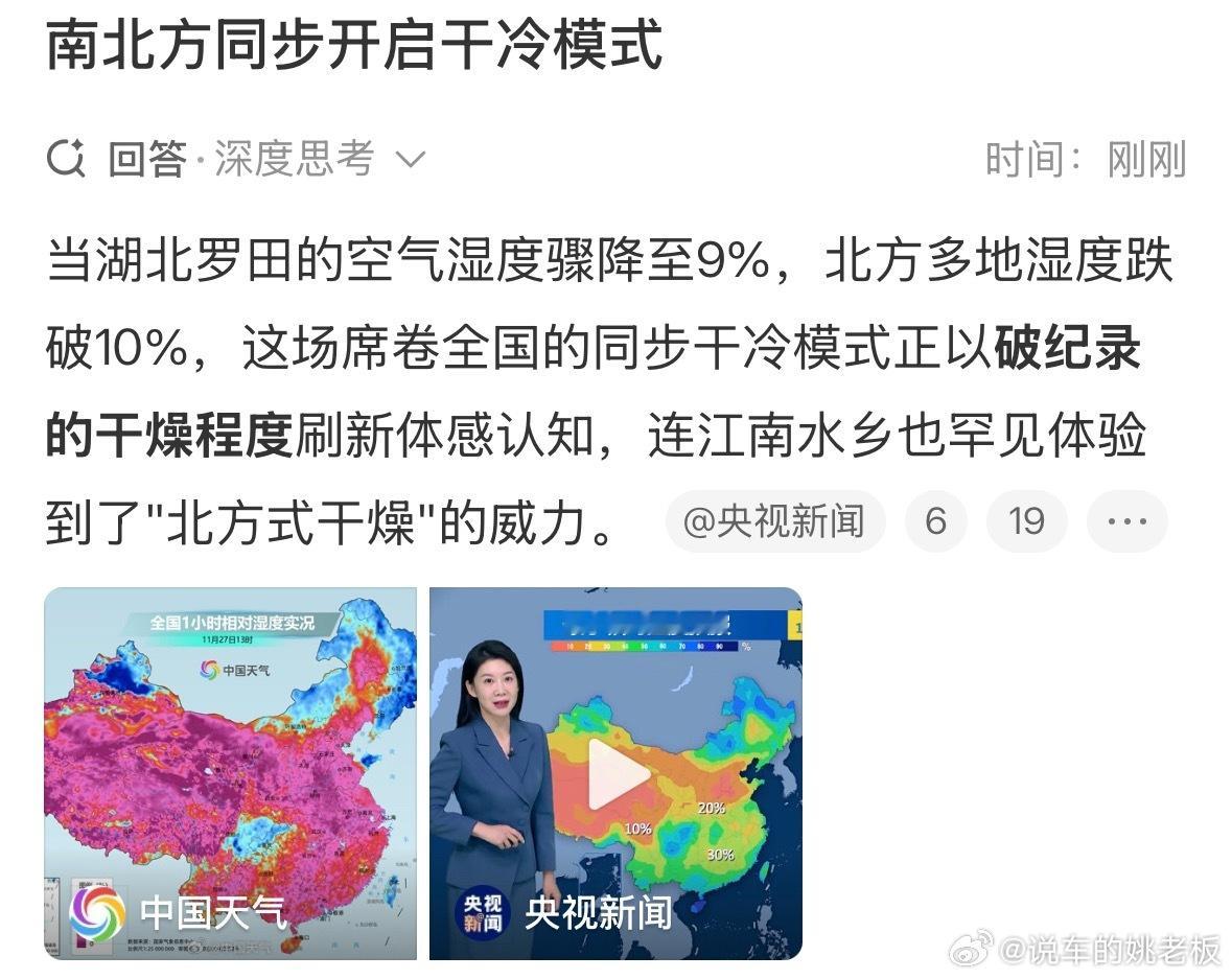 南北方同步开启干冷模式据气象监测,近期我国南北方受干冷空气影响,同步陷入干燥寒冷状态,干燥程度同期少见。北方多地湿度不足10%,江南及华南北部湿度跌破20%,湖北罗田等多地打破11月最干燥纪录。建议公众做好防寒保暖与补水润燥,严守用火安全。