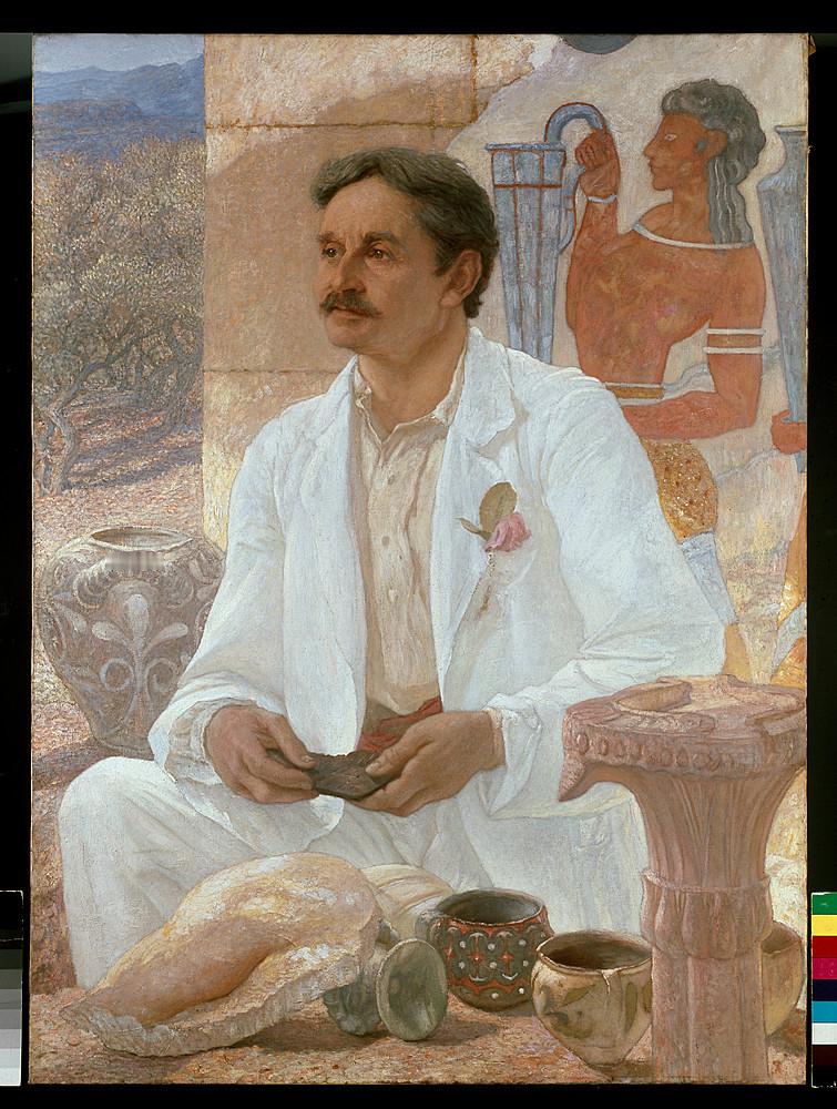 Arthur Evans爵士(1851-1941)出生赫特福德郡Hertfordshire 从1890年代中期开始,A. Evans的兴趣越来越集中到克里特岛。1899年,Evans用家里的钱买了伊拉克利翁(Ηράκλειο,Heraklion Iraklion,克里特岛中部)外的克法拉丘(Kephala)遗址。