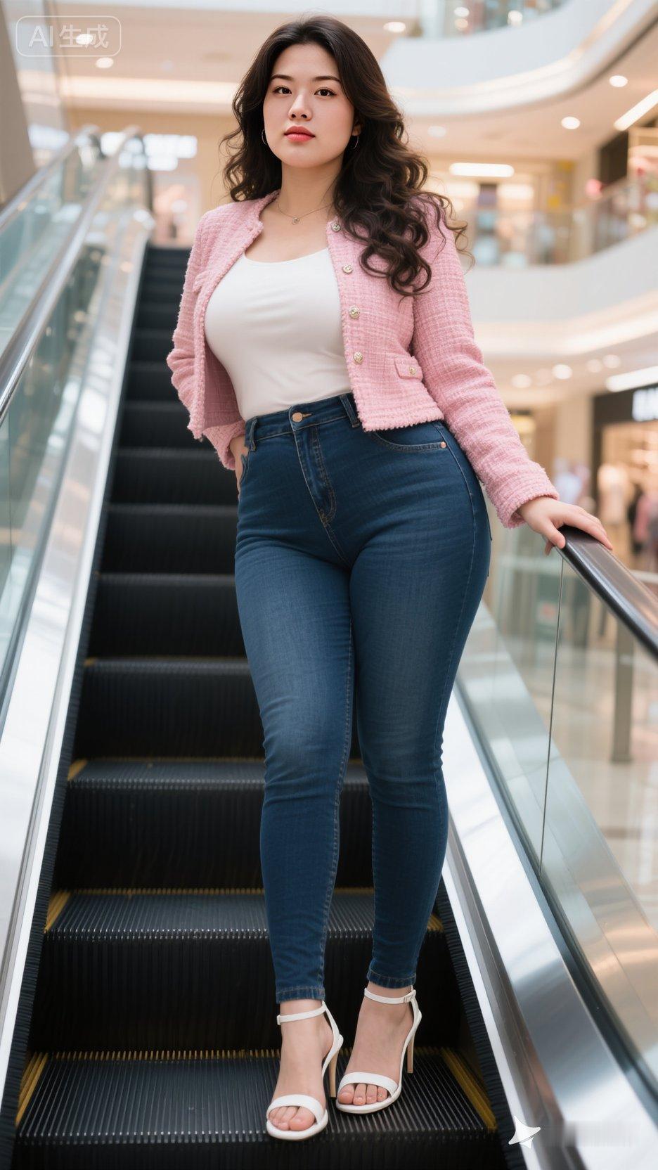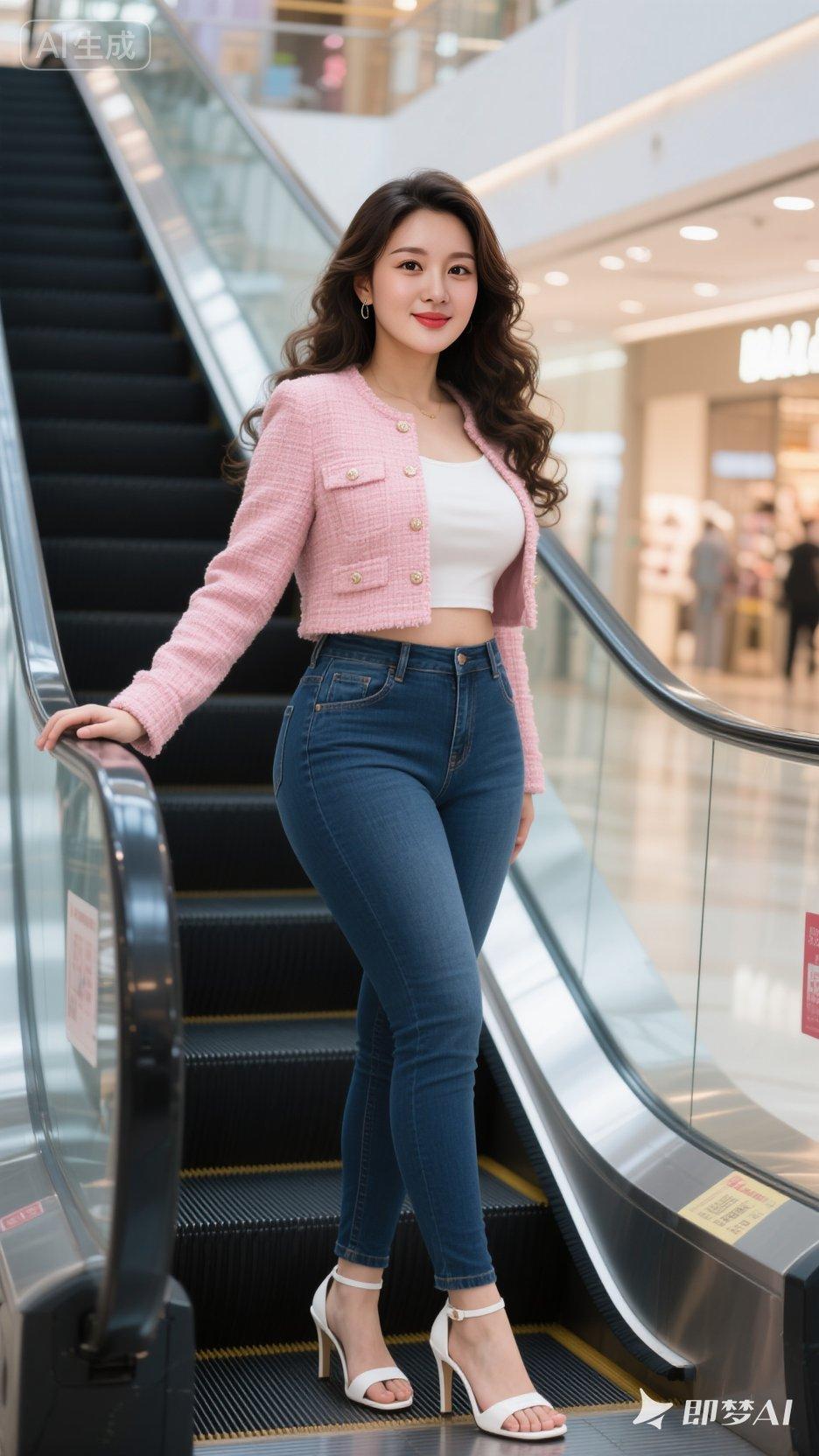 她穿着粉色外套和牛仔裤,在商场的自动扶梯上。