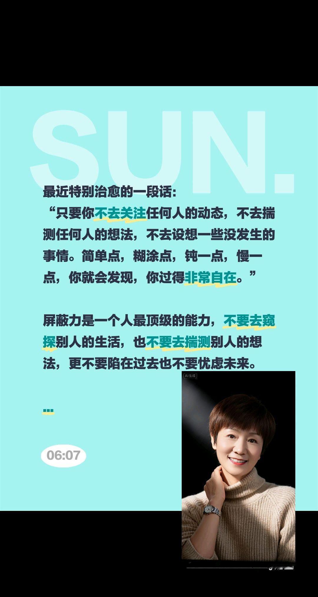 最近特别治愈的一段话: “只要你不去关注任何人的动态,不去揣测任何人的想法,不去设想一些没发生的事情。简单点,糊涂点,钝一点,慢一点,你就会发现,你过得非常自在。” 屏蔽力是一个人最顶级的能力,不要去窥探别人的生活,也不要去揣测别人的想法,更不要陷在过去也不要忧虑未来。 任何消耗你的人和事,多看一眼都是你的不对,把时间和精力还给自己,在声色名利中守住本心,在世俗目光里信步前行自愈文案 悦己越自由