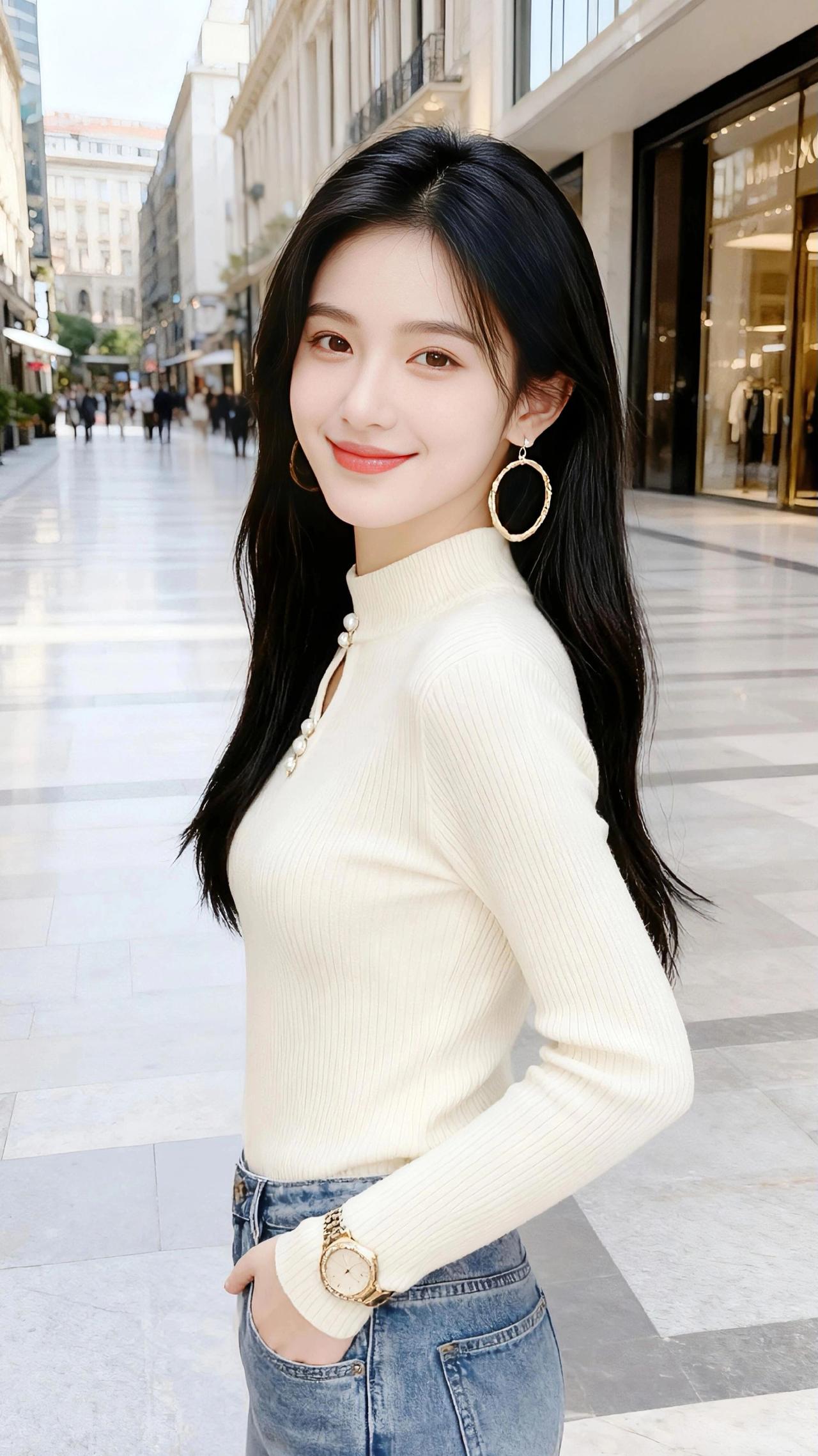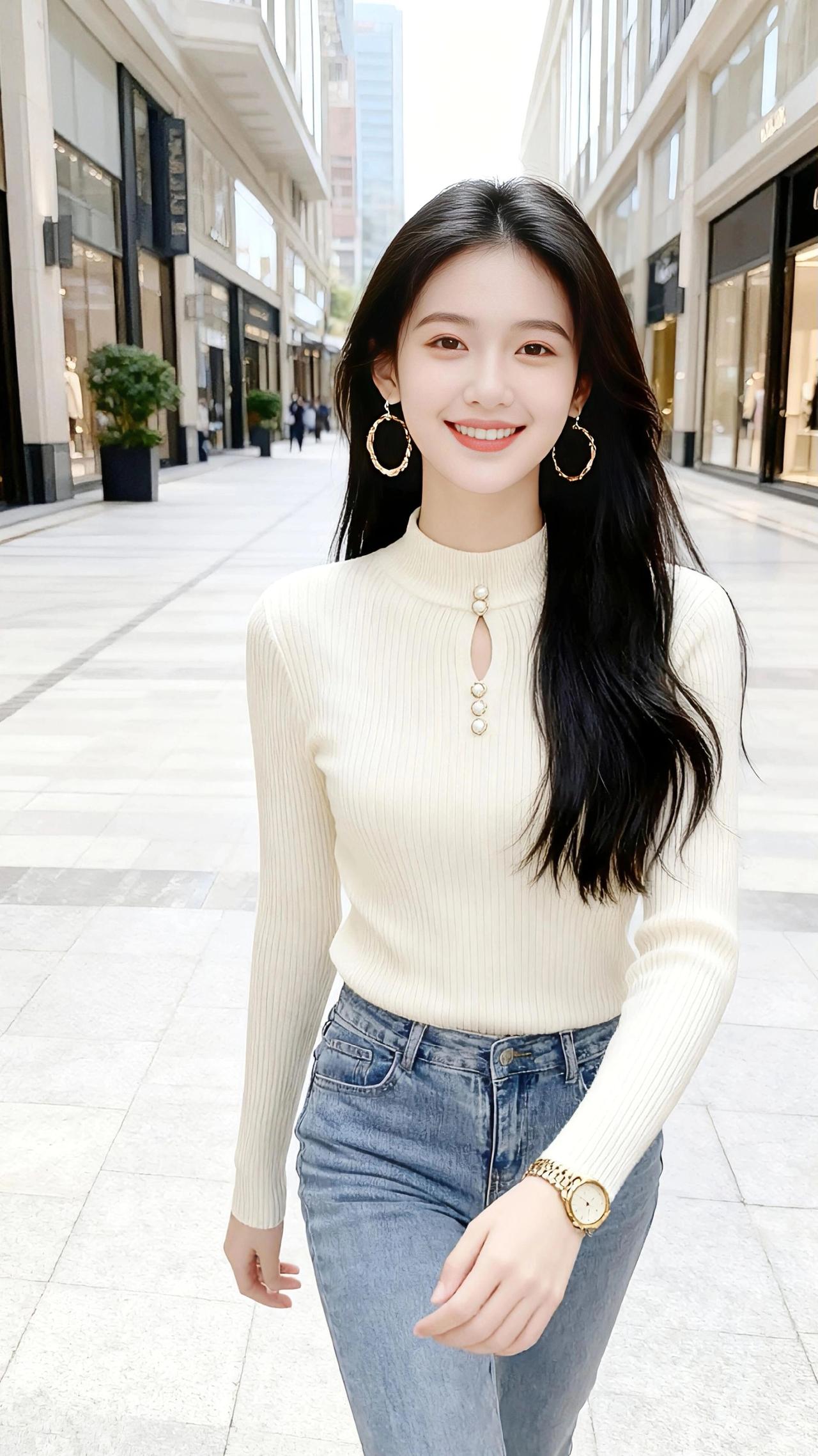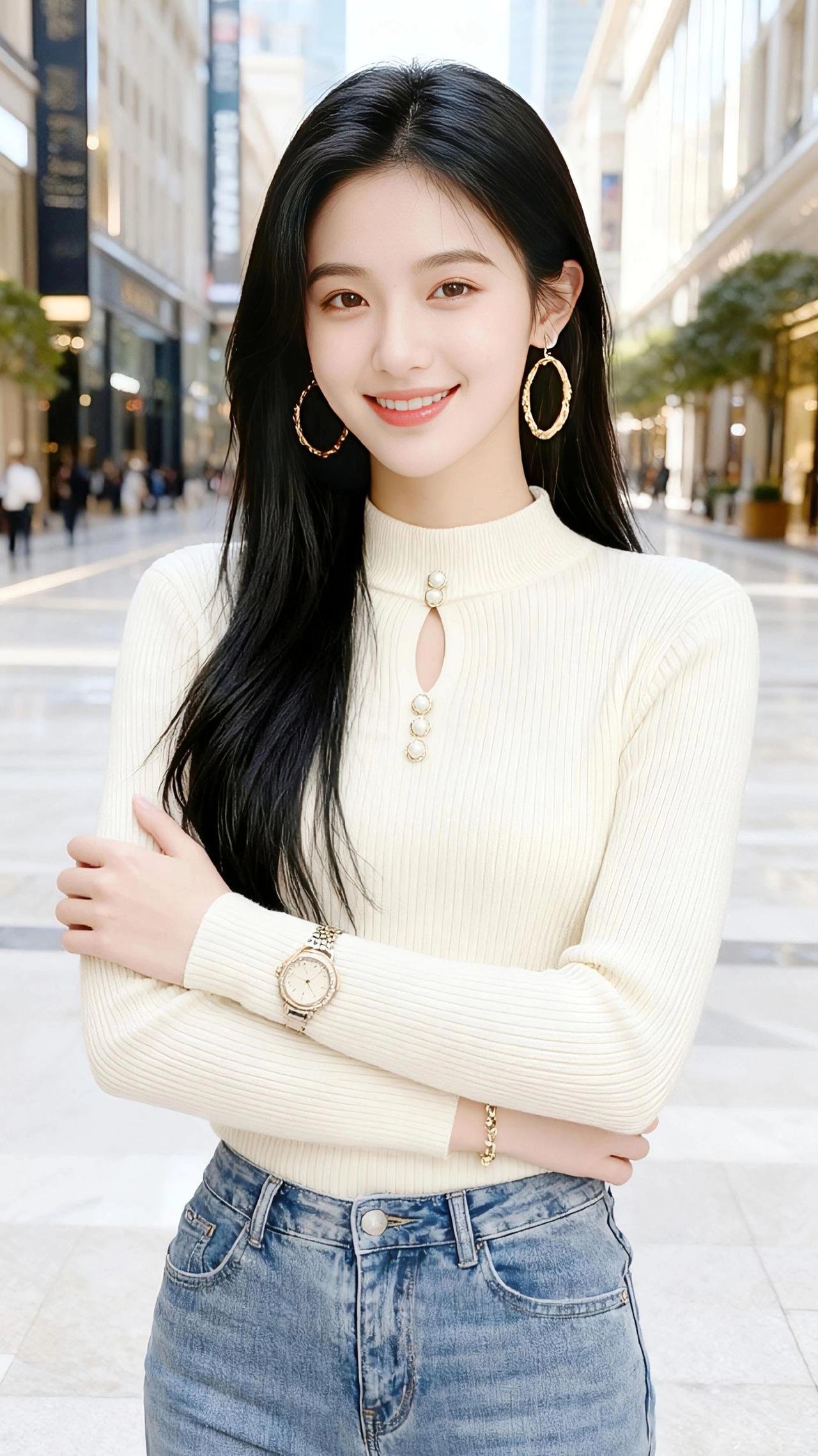 风裹着街景的香氛漫过肩头时,她正把笑窝浸在日光里。米白针织衫的纹路像被晒软的云,领口那几颗珍珠坠着细碎的光,随脚步轻晃成一串温柔的涟漪。 长发是黑绸裁的瀑,垂在肩头便揉碎了身后橱窗的金芒。她的笑是蓬松的,混着街面砖石的暖,漫过轻奢商圈的楼宇,落进路人余光里时,连风都慢了半拍。 牛仔裤裹着轻快的步点,腕间金表的光和耳坠碰了个轻响——这人间烟火里,她是恰好酿成的甜,是春日光影里,不用修饰的、生动的诗。 高级感穿搭 针织衫 清纯甜美 毛衣穿搭
