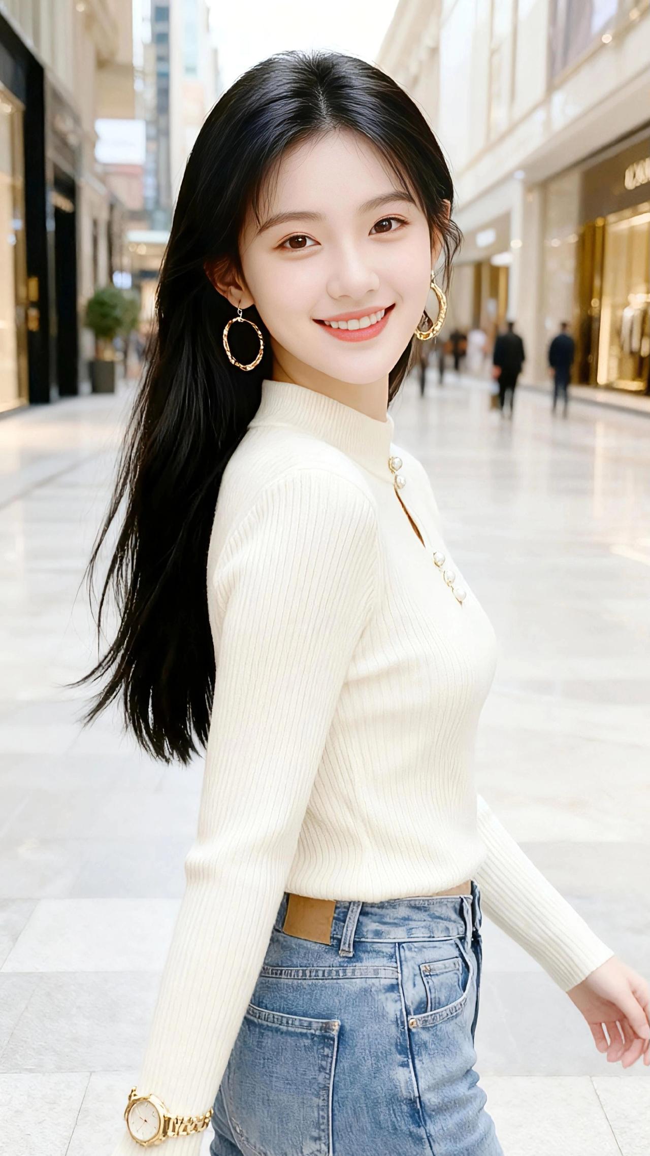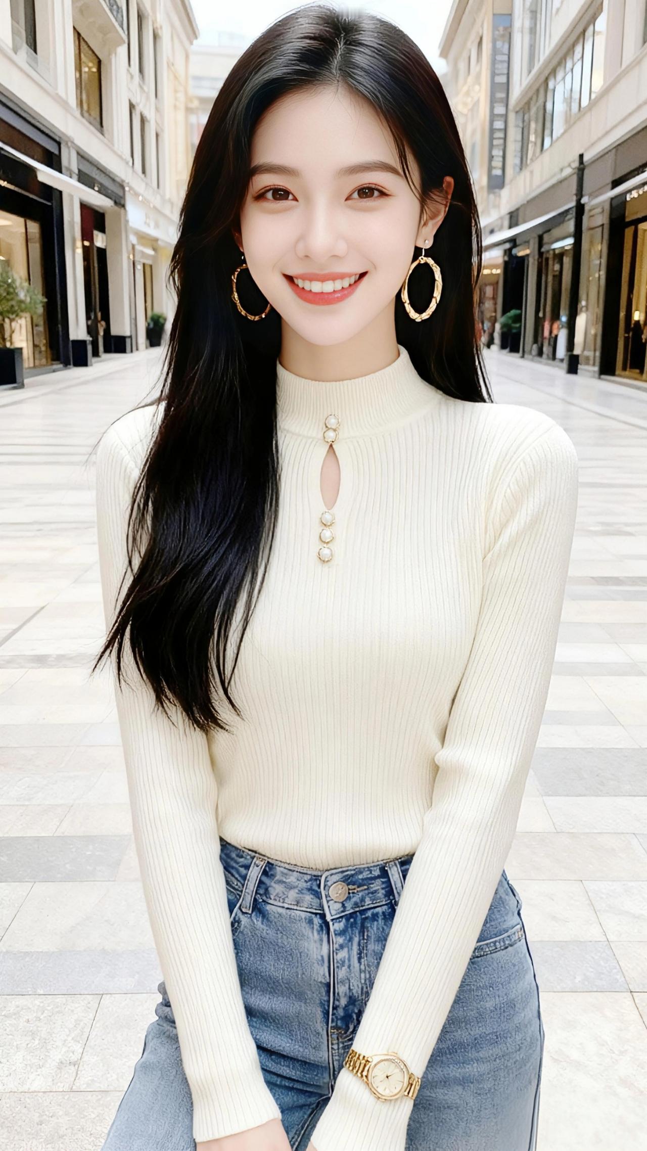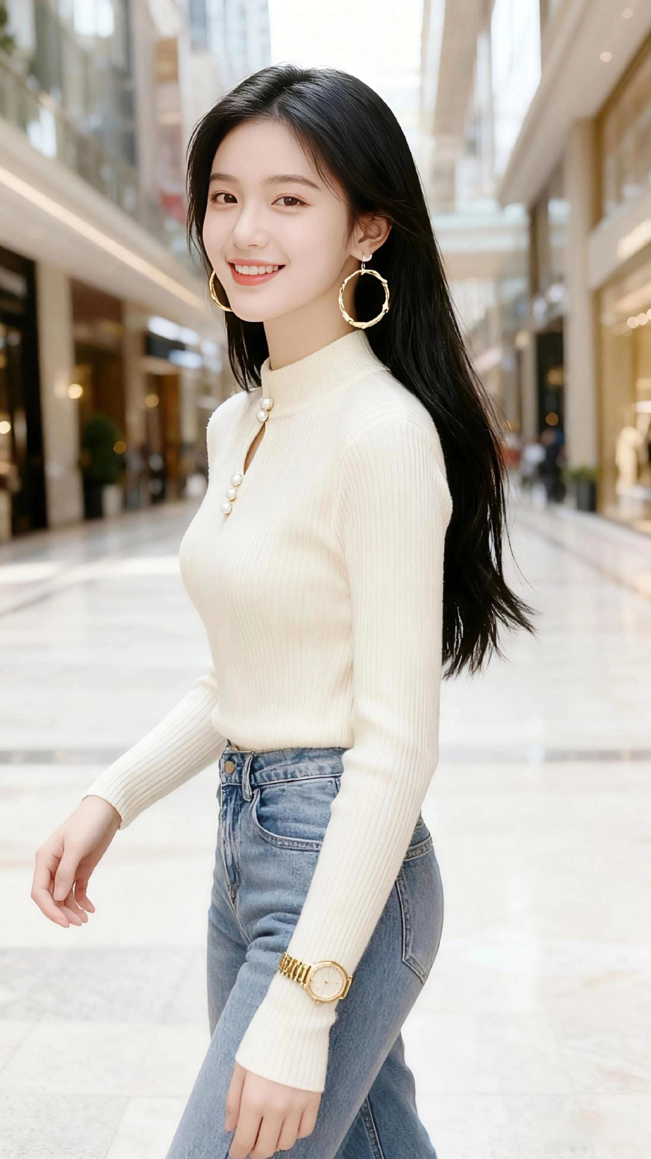 风裹着街景的香氛漫过肩头时,她正把笑窝浸在日光里。米白针织衫的纹路像被晒软的云,领口那几颗珍珠坠着细碎的光,随脚步轻晃成一串温柔的涟漪。 长发是黑绸裁的瀑,垂在肩头便揉碎了身后橱窗的金芒。她的笑是蓬松的,混着街面砖石的暖,漫过轻奢商圈的楼宇,落进路人余光里时,连风都慢了半拍。 牛仔裤裹着轻快的步点,腕间金表的光和耳坠碰了个轻响——这人间烟火里,她是恰好酿成的甜,是春日光影里,不用修饰的、生动的诗。 高级感穿搭 针织衫 清纯甜美 毛衣穿搭