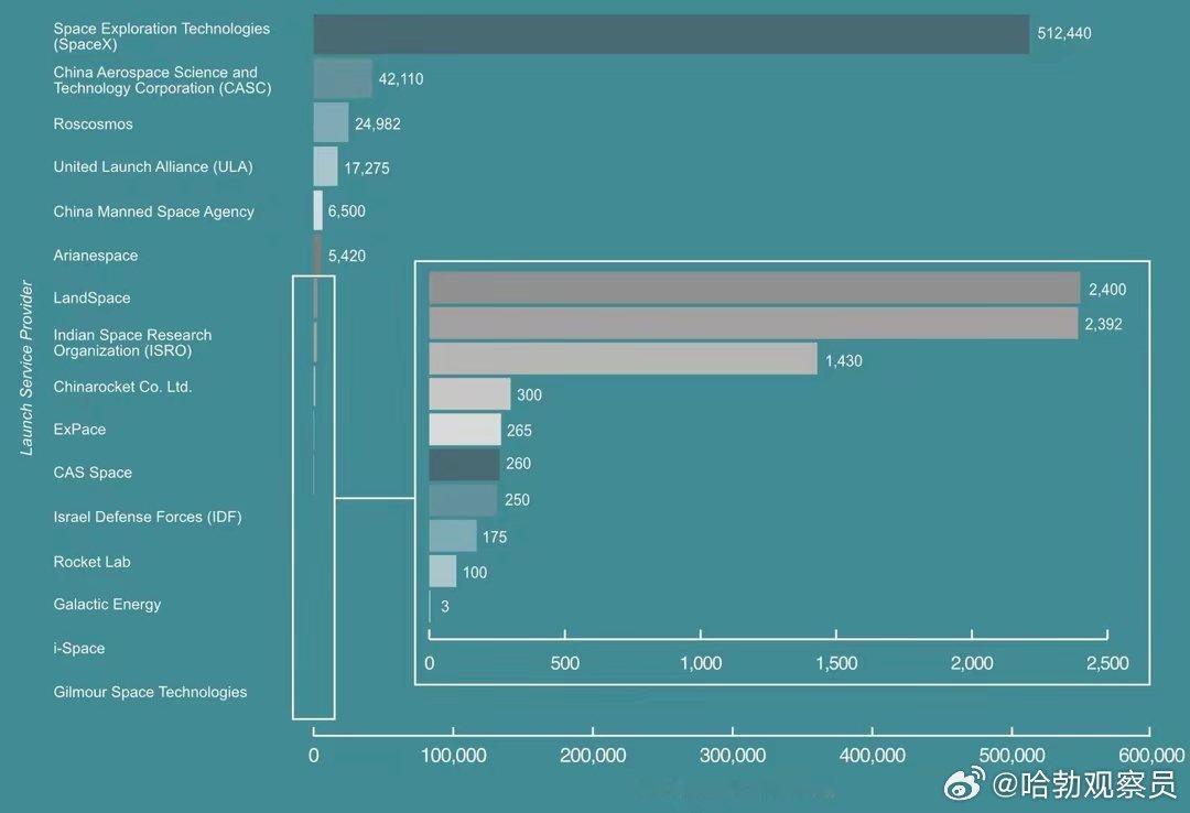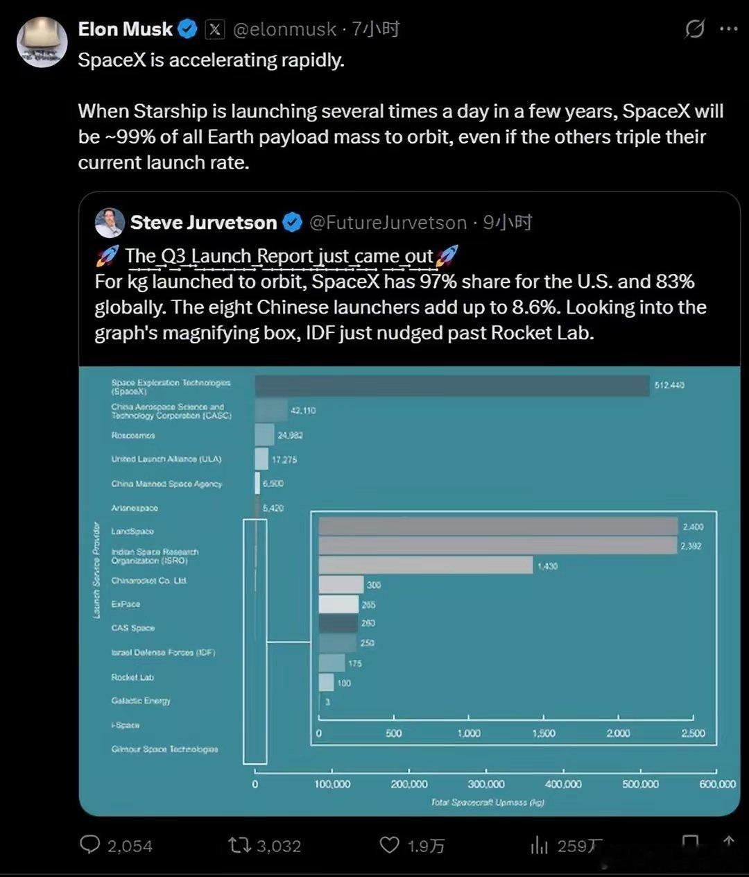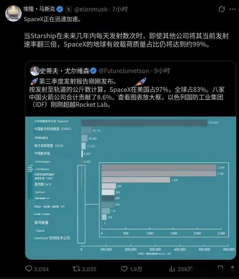 三季度报告:SpaceX占全球83%发射量。马斯克表示:星舰成熟后将占99%份额。热门微博科技快讯天文航天spacex