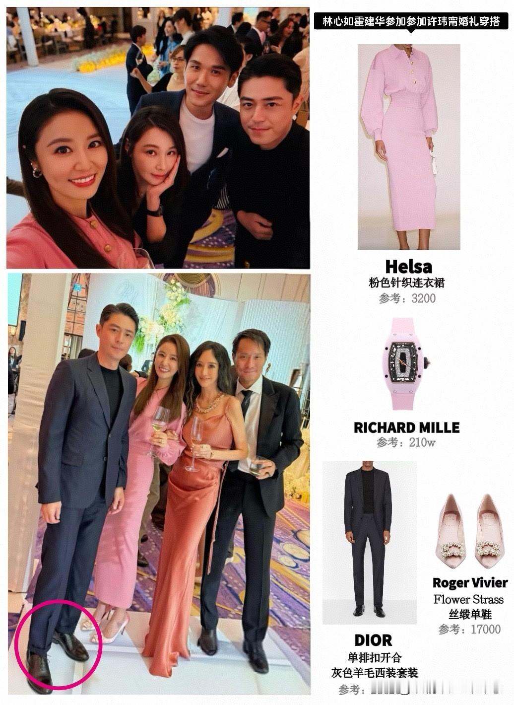 林心如霍建华出席邱泽许玮甯婚礼, 全身上下最便宜的竟然是那身裙装, 有谁注意到霍建华的西装裤子,还是挽起来的,不愧是老干部。 最近,林心如一身粉色打扮出席邱泽许玮甯婚礼,没想到全身上下最贵的竟然是她的手表,明星果然有钱,一块表210万。 据说林心如很喜欢收藏手表,而且她收藏的手表都相当奢华,价值从几十万到几百万不等,大多是顶级奢侈品牌,还有限量款。 之前林心如就在节目里说过和霍建华财政独立,林心如不仅是制片人,投资理财也很厉害,看来是赚了不少钱,能够收藏名表。 反观霍建华,还是一副老干部打扮,有种“妇唱夫随”的感觉,但是这次笑容多了一些,两口子状态都好好! 林心如 霍建华 邱泽许玮甯婚礼