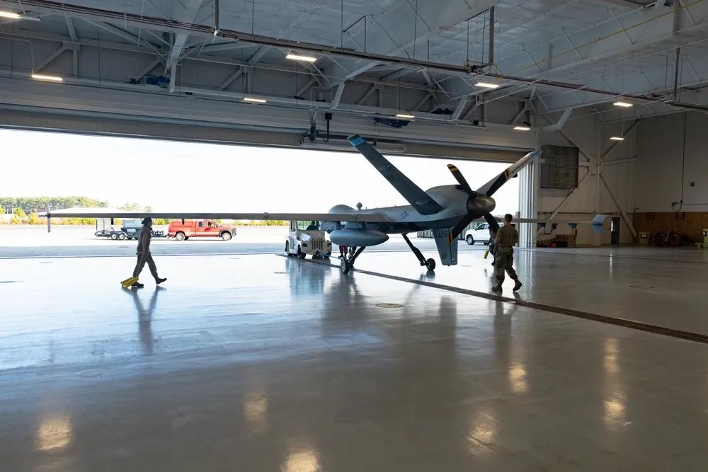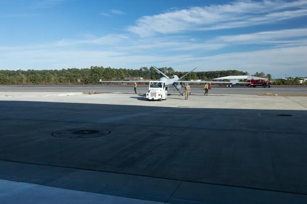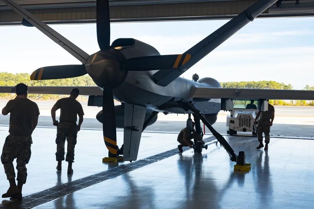 美国纽约州空军国民警卫队第174攻击联队的美空军官兵在北卡罗来纳州樱桃角海军陆战队航空站对MQ-9A 收割者无人机进行飞行后检查。美国海军陆战队无人机训练中队(VMUT-2)的海军陆战队员与空军官兵一起工作,以熟悉MQ-9A 收割者的操作程序,并验证空域和机库设施,为VMUT-2过渡到MQ-9A 收割者无人机做好准备。